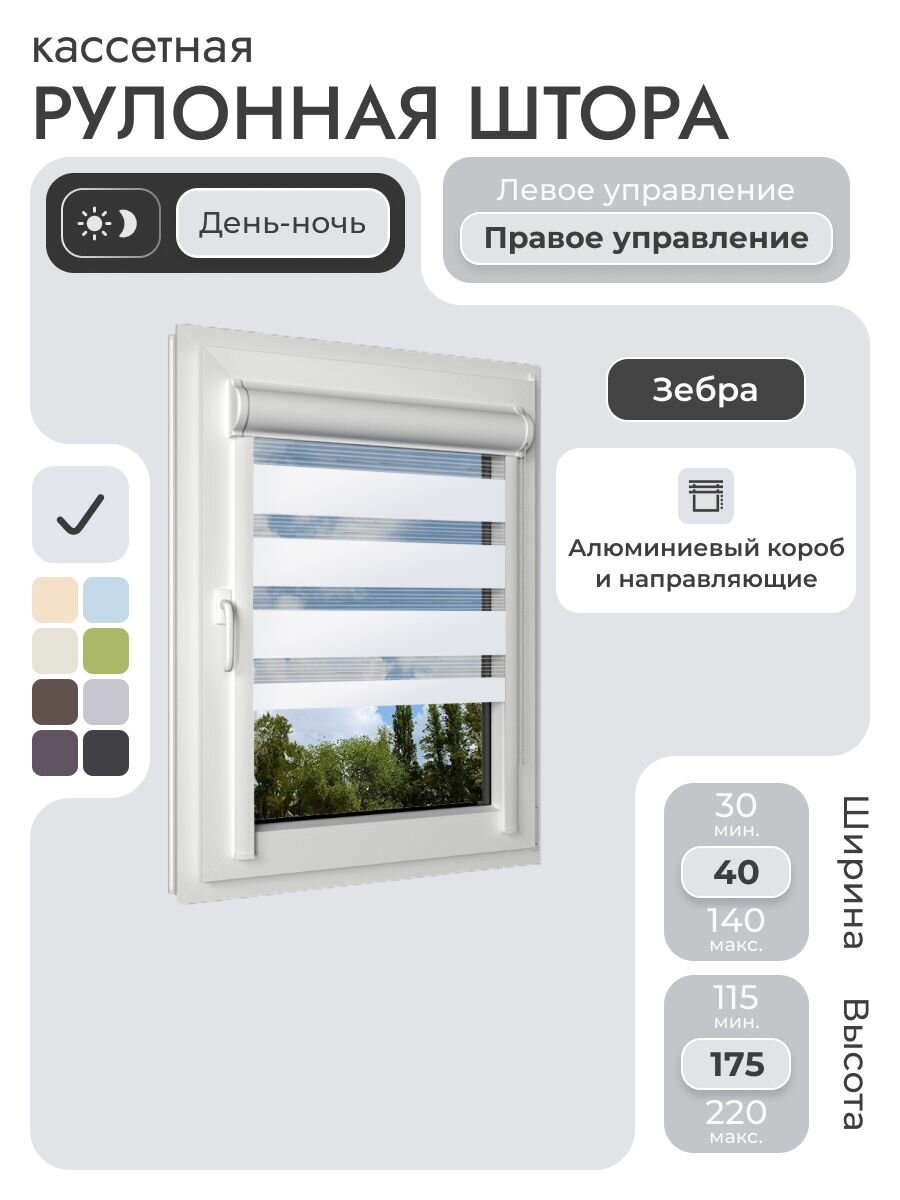 Кассетная рулонная штора 40×175 см, белый день/ночь (зебра), с правым управлением, с алюминиевыми направляющими на пластиковые окна/балкон, с вертикальными направляющими, без сверления, УНИ2: сравнение цен, характеристики, фото, актуальное наличие и цены.