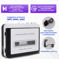 Кассетный плеер предназначен для оцифровки аудио кассет. Поддерживает форматы MP3, WMA, WAV. С помощью кассетного MP3 плеера вы можете конвертировать все свои ленты в цифровые файлы MP3 и послушать музыку так, как она звучала в 80-х и 90-х! Кассетный плеер с функцией аудиозахвата/преобразования и оцифровки магнитной записи в MP3 напоминает обычный кассетный плеер из детства. Он также может проигрывать кассеты, в нем есть автореверс. Но также есть и порт USB для подключения флешки (вы можете слушать MP3 файлы сразу) и маленькая кнопка, после нажатия которой проигрываемый с кассеты песня будет оцифрована в MP3 формат. После этого останется только подключить плеер к компьютеру и скопировать аудиофайл! Разъем 3,5 мм дает возможность подключить к плееру наушники. Устройство полностью совместимо со всеми современными компьютерами, имеющими USB порт, процессор выше Pentium 4, более 512 МБ ОЗУ, 1 Гб свободного пространства на жестком диске. Вес прибора составляет 120 грамм. Динамика в устройстве нет, прослушивать аудио можно только через наушники. Вы можете запитать кассетный проигрыватель от батарей (две батареи типа АА) или через USB-кабель.