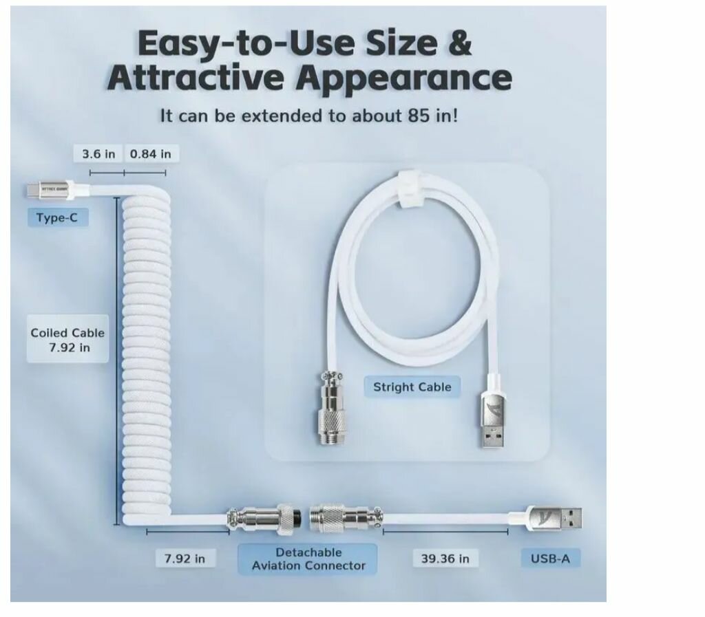 【Металлические разъемы Aviator】В разветвителях кабелей для клавиатуры ATTACK SHARK используются высококачественные металлические разъемы, обеспечивающие превосходную устойчивость к окислению и помехам, что делает соединение стабильным даже после длительного использования и многократного отключения от сети. Если вы используете его в паре с 60-процентной игровой клавиатурой, механической клавиатурой TKL или другими, он добавит текстуру вашему столу и заставит вашу клавиатуру выглядеть потрясающе!【 Премиум, долговечность и устойчивость к спутыванию】Используя четыре высококачественных медных провода и алюминиевую экранирующую фольгу в качестве сердечника, кабель USB-C для клавиатуры не боится сгибания или разрыва. Он также использует новый матовый нейлоновый материал с двухслойным переплетением тканой сетки + PET сетки на поверхности, добавляя шелк с блестками, чтобы представить сдержанную роскошь, красивую и нелегко потерять форму.【Профессиональная обратная намотка】При помощи нашего интенсивно разработанного процесса намотки кабеля, мы используем профессиональный способ обратной намотки. В результате мы создали сверхпрочную 22-миллиметровую "пружинистую" катушку, которая обладает значительным эффектом отскока и более существенным, что эффективно предотвращает повреждения, вызванные чрезмерным растяжением.【 Металлический авиационный разъем и высокоскоростная зарядка】Сверхпрочный металлический 4-контактный съемный разъем для кабеля Aviator позволяет быстро присоединять различные кабели к клавиатуре или другим аксессуарам. Поддерживается безопасная быстрая зарядка и синхронизация данных. Type-C интерфейс дизайн, идеально соответствует всем USB-C игровой клавиатуры питается и подключить потребности, в том числе RK61, M75, K55, SKYLOONG SK61 и многое другое.【Простая в использовании длина и отличное качество】Кабель ATTACK SHARK состоит из двух частей, 0,84 дюйма внутренний диаметр кабеля + 39,4 дюйма прямой кабель, общая длина около 65 дюймов, с возможностью расширения до 85 дюймов. Он также прошел многочисленные технические испытания, включая стабильность передач