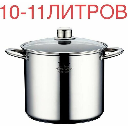 Большая высокая 11-10 литров кастрюля бак из нержавеющей стали с двойным капсульным индукционным дном, клёпаные не нагревающиеся ручки, мерная шкала, хромированная зеркальная полировка как в нутри так и с наружи, что облегчает уход за посудой, стеклянная крышка с паровыпуском. Кастрюля 10-11 литров, диаметр 26 см, высота 23 см
