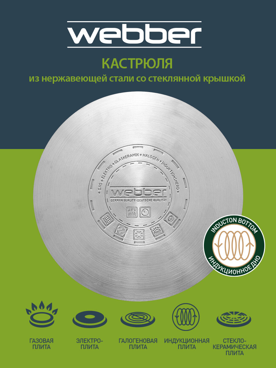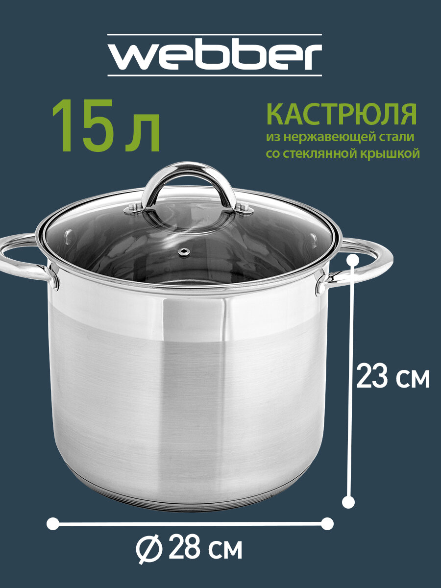 Кастрюля 15 литров, 28×23 см, из нержавеющей стали со стеклянной крышкой WEBBER BE-369/2: сравнение цен, характеристики, фото, актуальное наличие и цены.