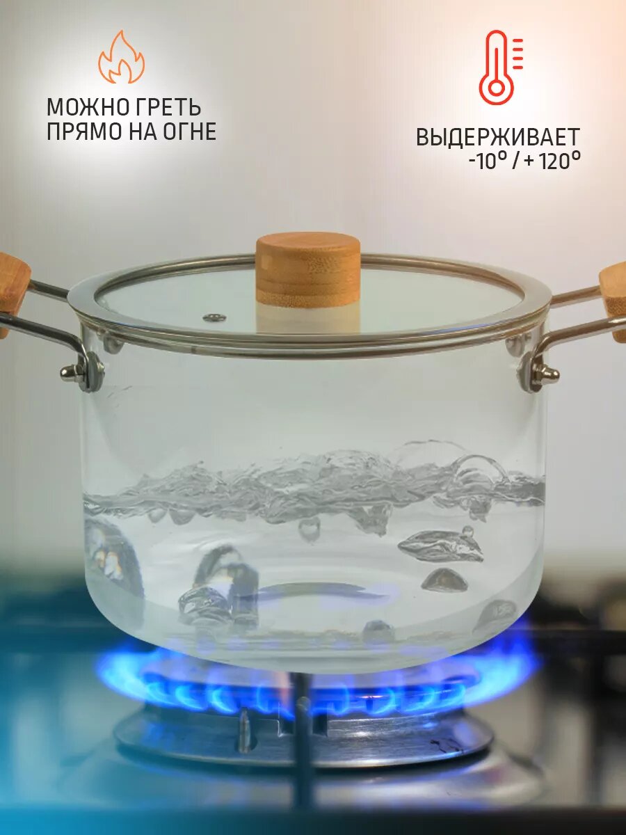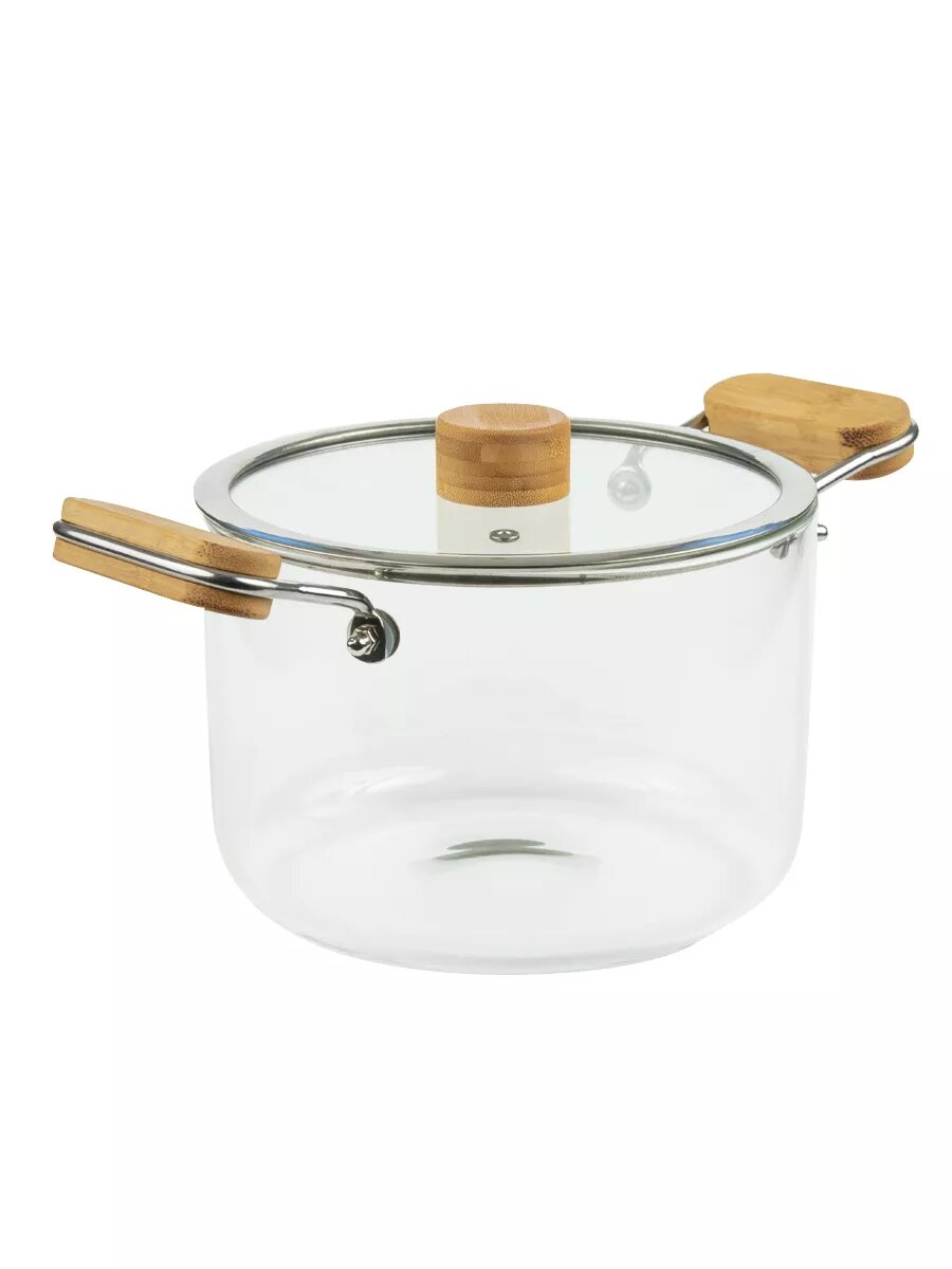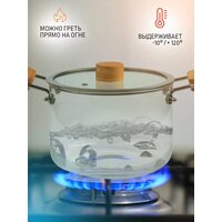 Кастрюля для приготовления стеклянная на 3.5 литра – это необычная и красивая посуда для кухни, которая выделяется на фоне остальной посуды, приносит визуальное удовольствие и однозначно станет одной из любимой на кухне. Кастрюля с деревянными ручками наполнит вашу кухню кулинарной эстетикой и атмосферой уюта. Прозрачная кастрюля стеклянная изготовлена из высококачественного жаропрочного боросиликатного стекла, устойчивого к высоким и низким температурам. Удобные ручки не нагреваются и комфортно лежат в руках. Кастрюля из термостойкого стекла способна выдержать максимальную температуру до +120 градусов и минимальную температуру до -10 градусов. Термостойкое стекло абсолютно никак не влияет на вкус и аромат приготовленной пищи, также не поглощает запахи и не выделяет вредных веществ при готовке. Данный материал является экологичным и безопасным при контакте с продуктами. Кастрюля прозрачная подходит для приготовления пищи на электрической и газовой плите, для индукционной плиты понадобится специальный адаптер (не входит в комплект!). Благодаря прозрачным стенкам удобно наблюдать за готовностью блюд. Стеклянные кастрюли можно использовать для приготовления супа, компота и морса, макаронных изделий или как контейнер для хранения продуктов, салатник или для засолки. Объём 3.5 л, диаметр дна 20 см, высота без крышки 13.5 см.