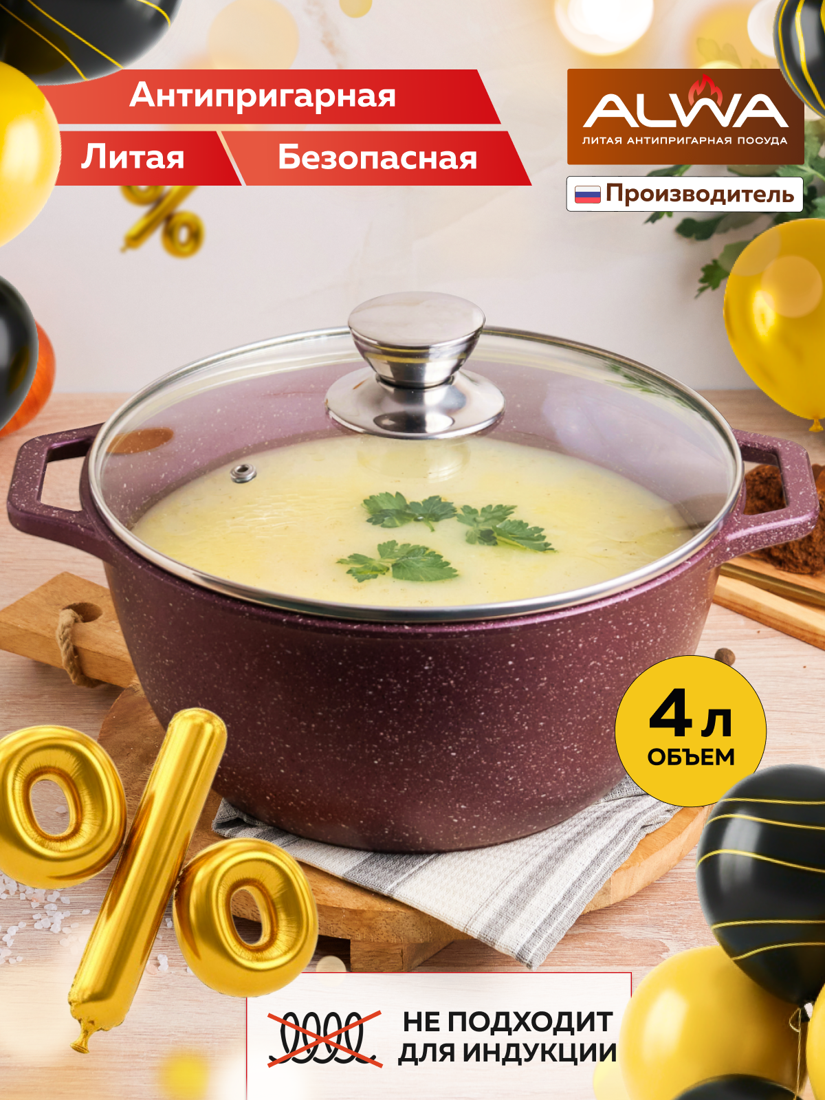 Алюминиевая кастрюля с антипригарным покрытием объемом 4 литра с крышкой от TM "Alwa" - это незаменимая посуда для приготовления вкусных блюд на кухне. Выполненная из литого высокопрочного алюминия, c толстым дном не только прочная и долговечная, но и легкая и удобная в использовании. Она снабжена крышкой, которая плотно закрывается, сохраняя вкус и аромат готовящейся еды. Антипригарное покрытие обеспечивает простоту приготовления и легкость очистки после него. Набор посуды Альва может быть использован для различных блюд, таких как супы, борщ, рагу, гуляш, соусы, гарниры, а также для запекания, выпечки мяса, рыбы и овощей в духовке. Большой объем кастрюльки, высота борта 11,5 см позволяет готовить для большой компании или семьи из 3-5 человек. Она может послужить и как декоративная, ведь ее внешний вид прекрасно сочетается и с домашней обстановкой и с праздничным столом. Вы сами решаете, какие функции сотейник выполняет сегодня. Можете смело экспериментировать с любыми рецептами и почувствовать себя настоящим поваром. Такая кастрюля мечта каждой хозяйки, она легко моется и не требует специального ухода. Вы можете смело экспериментировать с любыми рецептами и почувствовать себя настоящим шеф-поваром. Готовка плова в казане домашнем на плите, традиция многих семей. Мы производим все наши изделия в России, благодаря высокотехнологичному оборудованию они безупречного качества и по доступной цене, соответствует стандартам качества и ГОСТ, комплектуются инструкцией по эксплуатации и надежно упакованы. Технология ручного литья под давлением позволяет увеличить срок эксплуатации, поэтому наши жаровники, мультиварки отличаются своей долговечностью и простотой в уходе. Алюминиевые изделия прекрасно сохраняют первозданный вкус. Никаких посторонних запахов от материала. Казанок стильная, стальная подходит для духовки, для всех типов плит, кроме индукционных. Кастрюлька маленькая легко моется и не требует специального ухода. Мыть в посудомоечной машине необходимо на ЭКО режиме, используя моющие средства с низким уровнем рН, так как средство сильной концентрацией может повредить антипригарное покрытие. Сковорода и жаровня литая из пищевого алюминия прекрасно дополняют друг друга на кухне каждой семьи. Переходите в наш магазин, там Вас ждут всевозможные товары: гриль, жаровни, ковши, сковороды, блинница и многое другое. Вы сможете собрать набор любимой посуды, которая удовлетворит все Ваши пожелания. Кухонный инвентарь марки ТМ "ALWA" - поможет вам определиться с подарком женщине, девушке, на день рождения для мамы, бабушки, коллеге, подруге, любимому папе, парню, мужчине, другу, дедушке или мужу на др. Такой подарок не оставит никого равнодушным в Рождество, на новоселье, годовщину свадьбы, юбилей, День Победы, День Молодежи, День Медицинского работника, День Железнодорожника. Термокастрюля для шашлыка казан можно брать с собой на рыбалку, в рыболовный лагерь, на отдых на природе, она станет незаменимым помощником для мангала, костра, на туризм/походы, в поход, кемпинг, для открытого огня, мангала, дачи, пикник, костер или с легкостью приготовить на газу, походная кухня. Возьмите с собой на Алтай. Кухонная утварь от ТМ Алва в линейке мраморная пасуда - незаменимый помощник для дома. Апрель ским днем она служит как столовая так и туристическая,