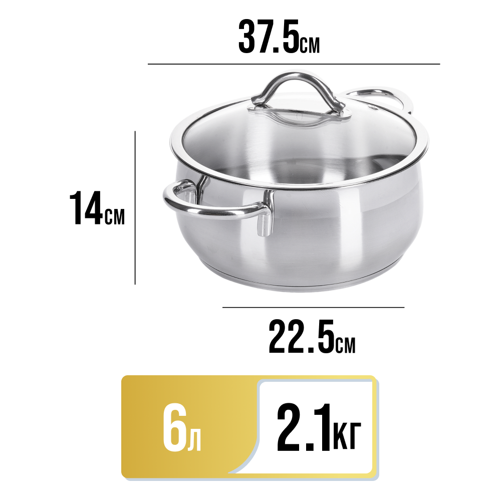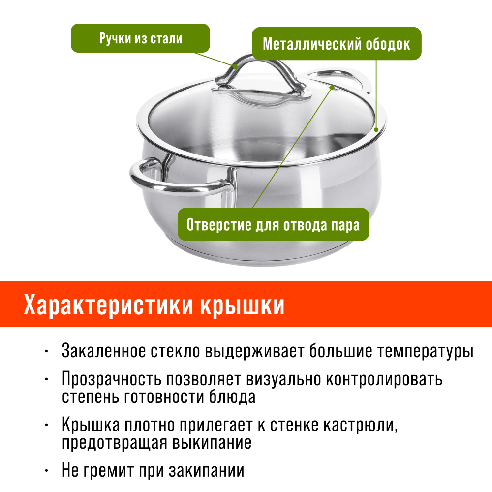 Кастрюля с крышкой HOME PERFECT выполнена из высококачественной нержавеющей стали с многослойным термоаккумулирующим дном, способствующим высокой теплопроводности и равномерному распределению тепла. Нержавеющая сталь обладает высокой устойчивостью к коррозии, не вступает в реакцию с холодными и горячими продуктами и полностью сохраняет их вкусовые качества. Посуда идеальна для приготовления здоровой пищи с минимальным количеством жира, что обеспечивает снижение потери витаминов, минеральных веществ и сохраняет аромат приготовленных блюд. Посуда очень удобна в использовании и элегантна. Крышка выполнена из термостойкого стекла с металлическим ободком и отверстием для выхода пара. Подходит для использования на всех типах плит, включая индукционные. Подходит для мытья в посудомоечной машине.