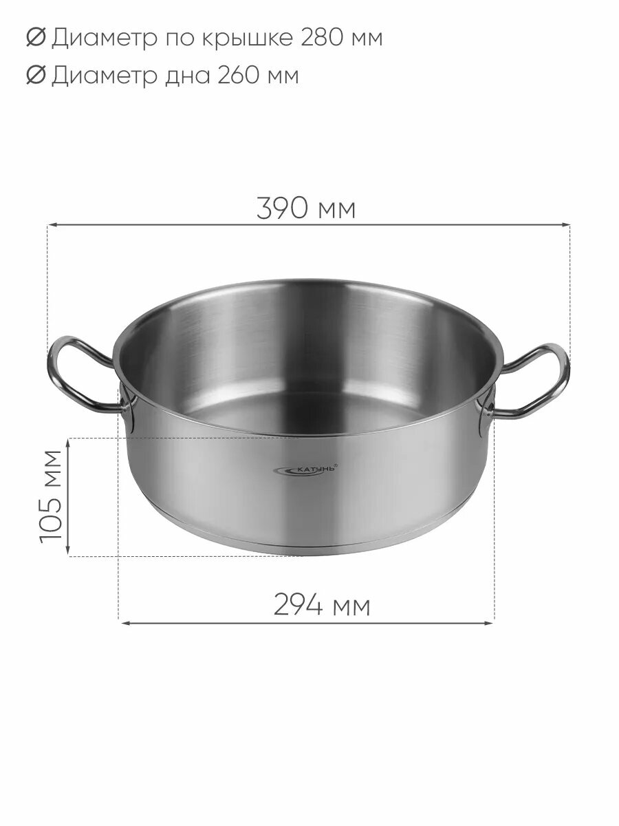 Кастрюля 6 л ТМ "Катунь" изготовлена из высококачественной нержавеющей стали. Благодаря многослойному термоаккумулирующему дну происходит равномерное распределение температуры по всей поверхности, что обеспечивает быстрое приготовление пищи. Ручки прикреплены методом клёпочной фиксации. Мерная шкала на внутренней стенке кастрюли поможет контролировать объем жидкости. Посуда данной серии подходит для всех современных типов плит, в том числе индукционных, а также для чистки в посудомоечной машине. Объем кастрюли 6 л, диаметр по крышке 28 см, диаметр дна 26 см, высота стенки 10.5 см. Сделано в России. Обращаем Ваше внимание, кастрюля поставляется без крышки.