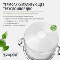 Кастрюля 9 л, D24 см с крышкой оснащена запатентованной технологией термоаккумулирующего компактного дна от Zepter, состоящего из 3-х слоев различных металлов, что позволяет посуде быстро накапливать и поддерживать энергию. Тепло мгновенно проходит через дно к стенкам посуды, не сбавляя обороты, а затем равномерно распределяется по всей посуде. Это свойство позволяет готовить пищу при низких температурах, что снижает потребление энергии и позволяет продуктам сохранять свои полезные свойства без потери питательных веществ. Таким образом, приготовление пищи производится при высоких температурах, значительно превышающих температуры кипения.