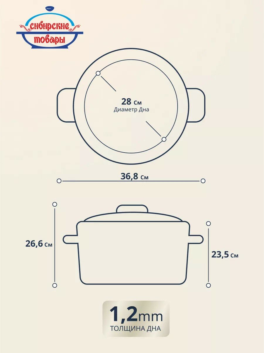Кастрюля эмалированная 14 литров с крышкой - незаменимая помощница на кухне любой хозяйки. Эмалированная кастрюля со стальной крышкой обладает толстым дном, благодаря чему происходит равномерное распределение тепла и еда не пригорает к стенкам кастрюли. Кастрюлька бренда "Сибирские товары" подходит для газовой плиты, а так же для стеклокерамической и электрической, проще говоря - кастрюля для всех плит. Ручки кастрюли выполнены из стали с покрытием эмаль. Продукция изготовлена в соответствии с ГОСТ 24788-2018, толщина эмали не менее 0.20 мм. Посуда для дома изготовлена из высококачественной стали с покрытием из эмали, которые по функционалу похожи на кастрюли с антипригарным покрытием. Отличается надежным долговечным покрытием и является лучшим выбором для подарка на новый год, новоселье, день рождения любимым женщинам. Кастрюля маленькая и кастрюля большая отлично подойдет для каши, сохранив все полезные свойства продуктов. Для мытья кастрюли с принтом можно воспользоваться посудомоечной машинкой или мыть руками без использования абразивных средств и металлических губок. Для сохранения покрытия посуды допускают использование только деревянных и силиконовых кухонных принадлежностей и аксессуаров.