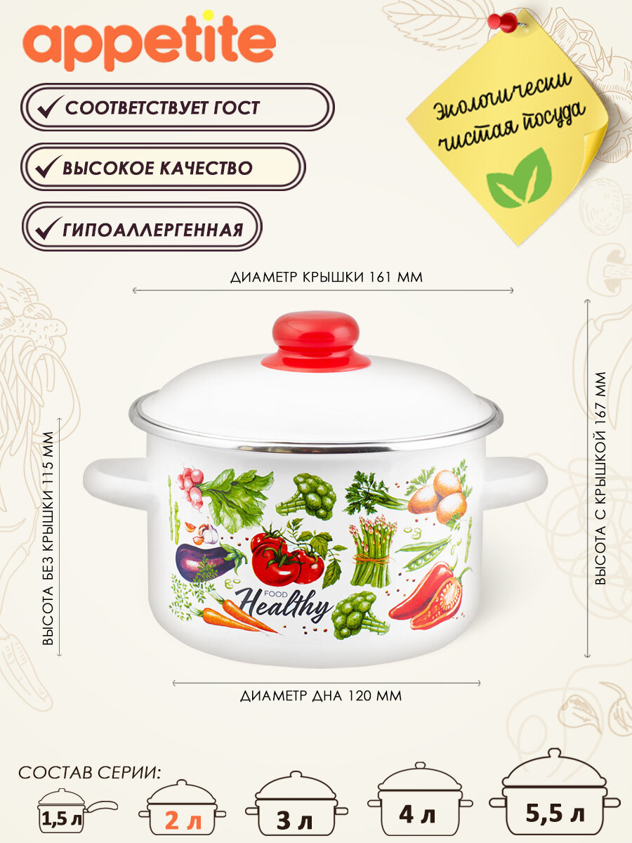 Кастрюля Appetite Veggies 2 л эмалированная сталь с крышкой. Эмалированная кастрюля емкостью 2 литра ТМ Appetite серии Veggies. Посуда очень экологична, не вступает в реакцию с пищевыми кислотами и щелочами, тем самым сохраняется вкус пищи, в нее не попадают вредные для здоровья человека соединения. В кастрюле можно не только готовить, но и безопасно хранить пищу. Кастрюля отличается высоким качеством, гладкая не пористая поверхность посуды обеспечивает простой и легкий уход. Изделие подходит для всех видов плит: индукционных, газовых, электрических, стеклокерамических. Можно мыть в посудомоечной машине.