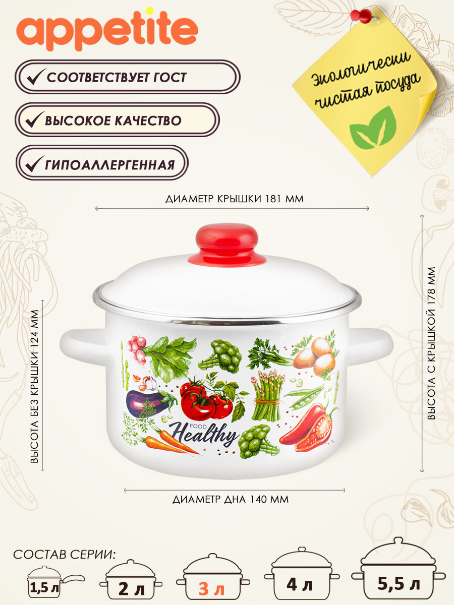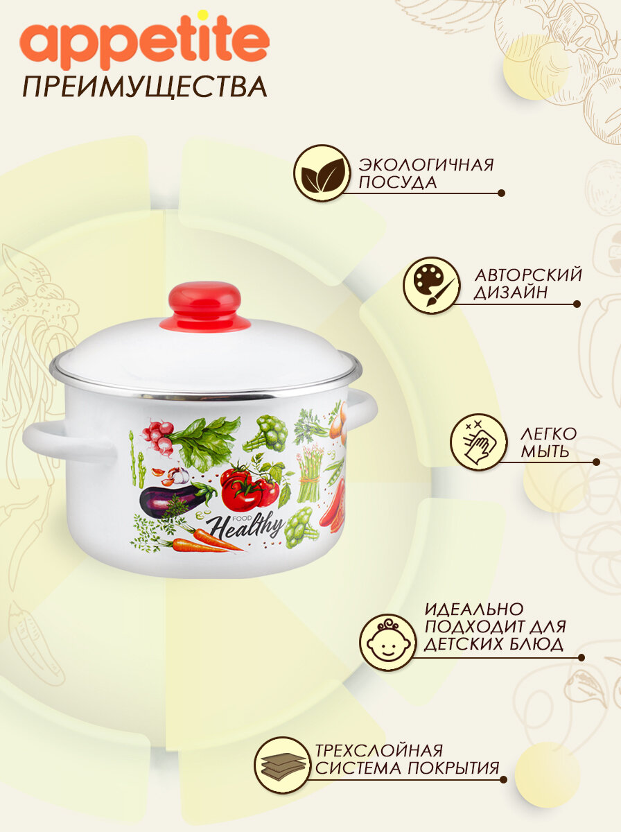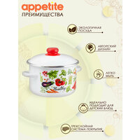 Кастрюля Appetite Veggies 3 л эмалированная сталь с крышкой. Эмалированная кастрюля емкостью 3 литра ТМ Appetite серии Veggies. Посуда очень экологична, не вступает в реакцию с пищевыми кислотами и щелочами, тем самым сохраняется вкус пищи, в нее не попадают вредные для здоровья человека соединения. В кастрюле можно не только готовить, но и безопасно хранить пищу. Кастрюля отличается высоким качеством, гладкая не пористая поверхность посуды обеспечивает простой и легкий уход. Изделие подходит для всех видов плит: индукционных, газовых, электрических, стеклокерамических. Можно мыть в посудомоечной машине.
