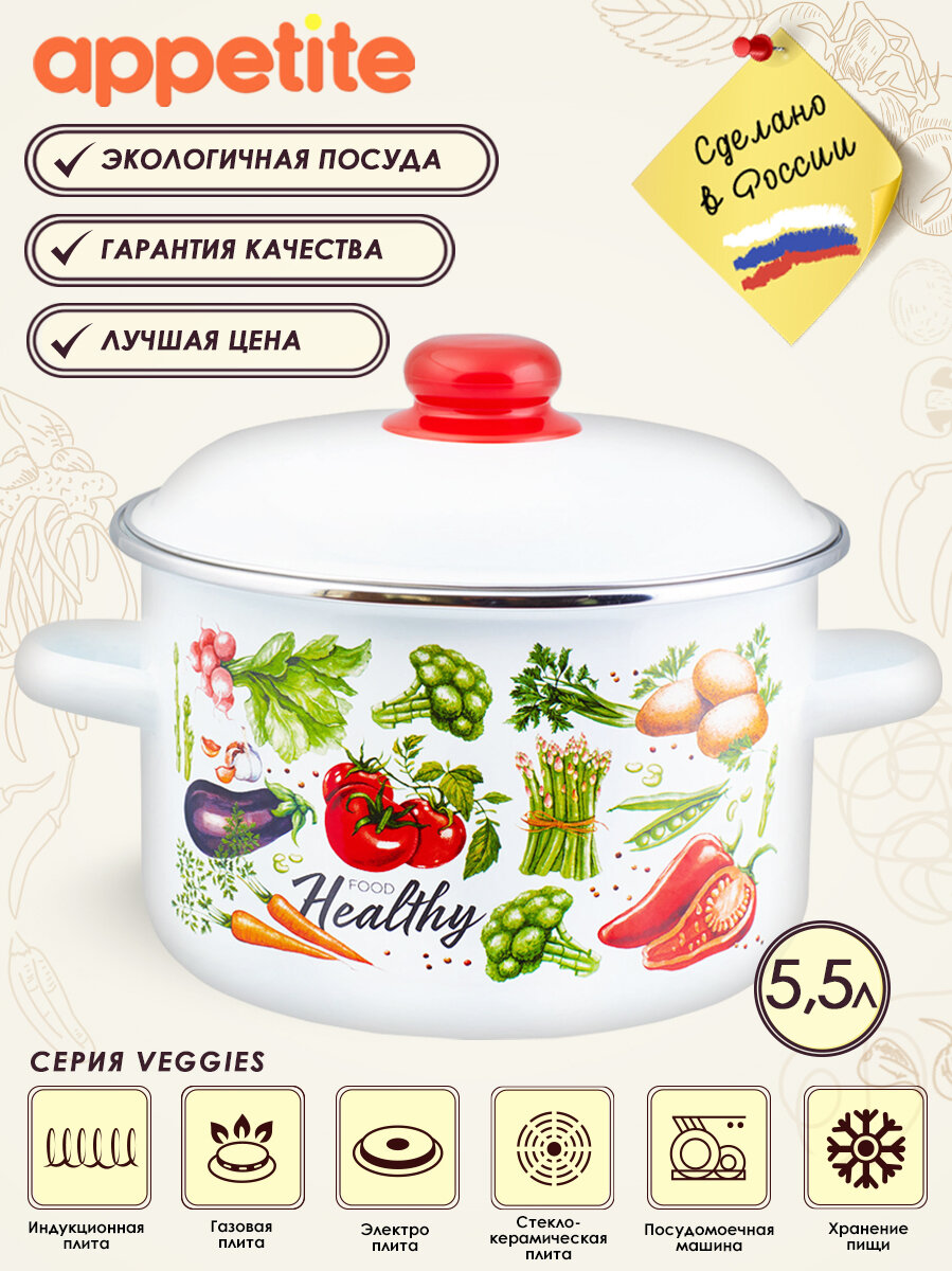 Купить Кастрюля эмалированная с крышкой Veggies 5,5л ТМ Appetite с доставкой по всей России. Кастрюля эмалированная с крышкой Veggies 5,5л ТМ Appetite: сравнение цен, характеристики, фото, актуальное наличие и цены.