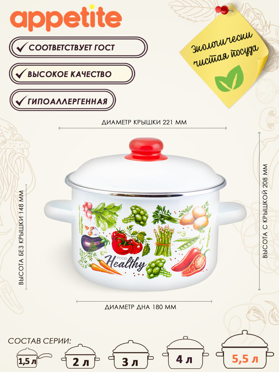 Кастрюля Appetite Veggies 5.5 л эмалированная сталь с крышкой. Эмалированная кастрюля емкостью 5.5 литров ТМ Appetite серии Veggies. Посуда очень экологична, не вступает в реакцию с пищевыми кислотами и щелочами, тем самым сохраняется вкус пищи, в нее не попадают вредные для здоровья человека соединения. В кастрюле можно не только готовить, но и безопасно хранить пищу. Кастрюля отличается высоким качеством, гладкая не пористая поверхность посуды обеспечивает простой и легкий уход. Изделие подходит для всех видов плит: индукционных, газовых, электрических, стеклокерамических. Можно мыть в посудомоечной машине.