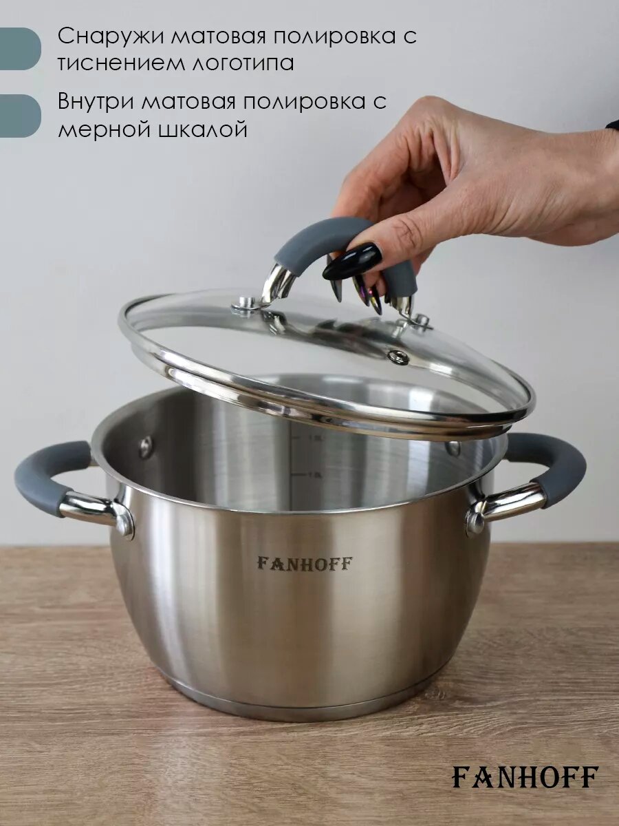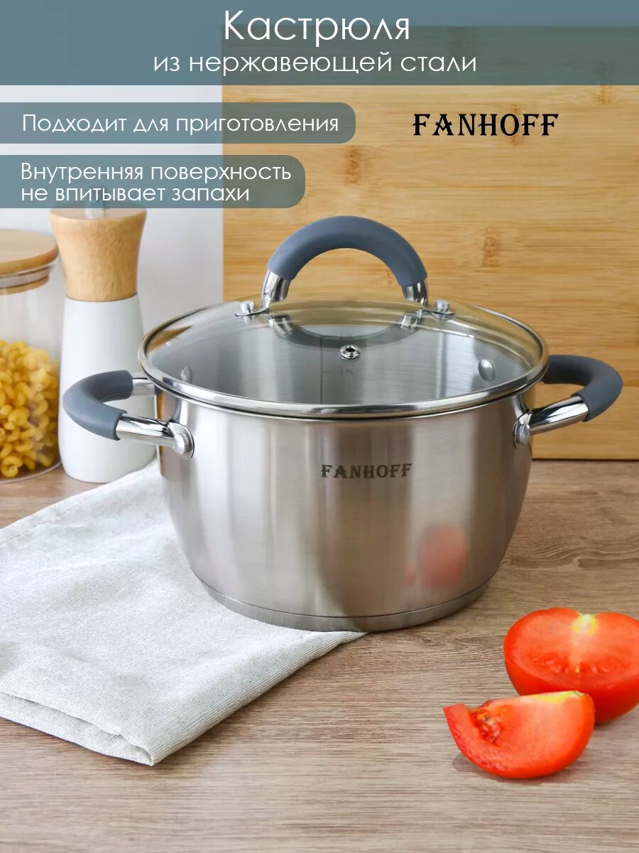 Купить Кастрюля FANHOFF 2,4 л, нержавеющая сталь, стеклянная крышка, для всех видов плит с доставкой по всей России.