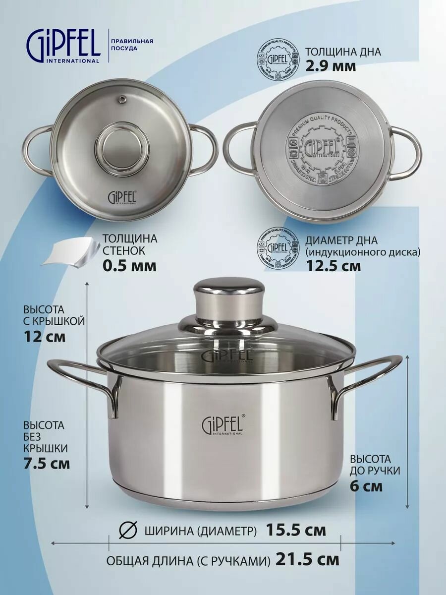 Кастрюля из нержавеющей стали Gipfel Mini 1204 диаметром 14 см, высотой 8 см, объемом 0,9 л. Диаметр дна 13 см. Изготовлена из нержавеющей стали 18/10, благодаря ей кастрюля долговечная, надежная и устойчивая к коррозии.