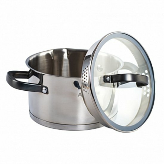 Крышка кастрюли выполнена из того же материала, что и сама кастрюля, и оснащена отверстием для выпуска пара. Это позволяет контролировать процесс приготовления и сохранять полезные свойства продуктов.