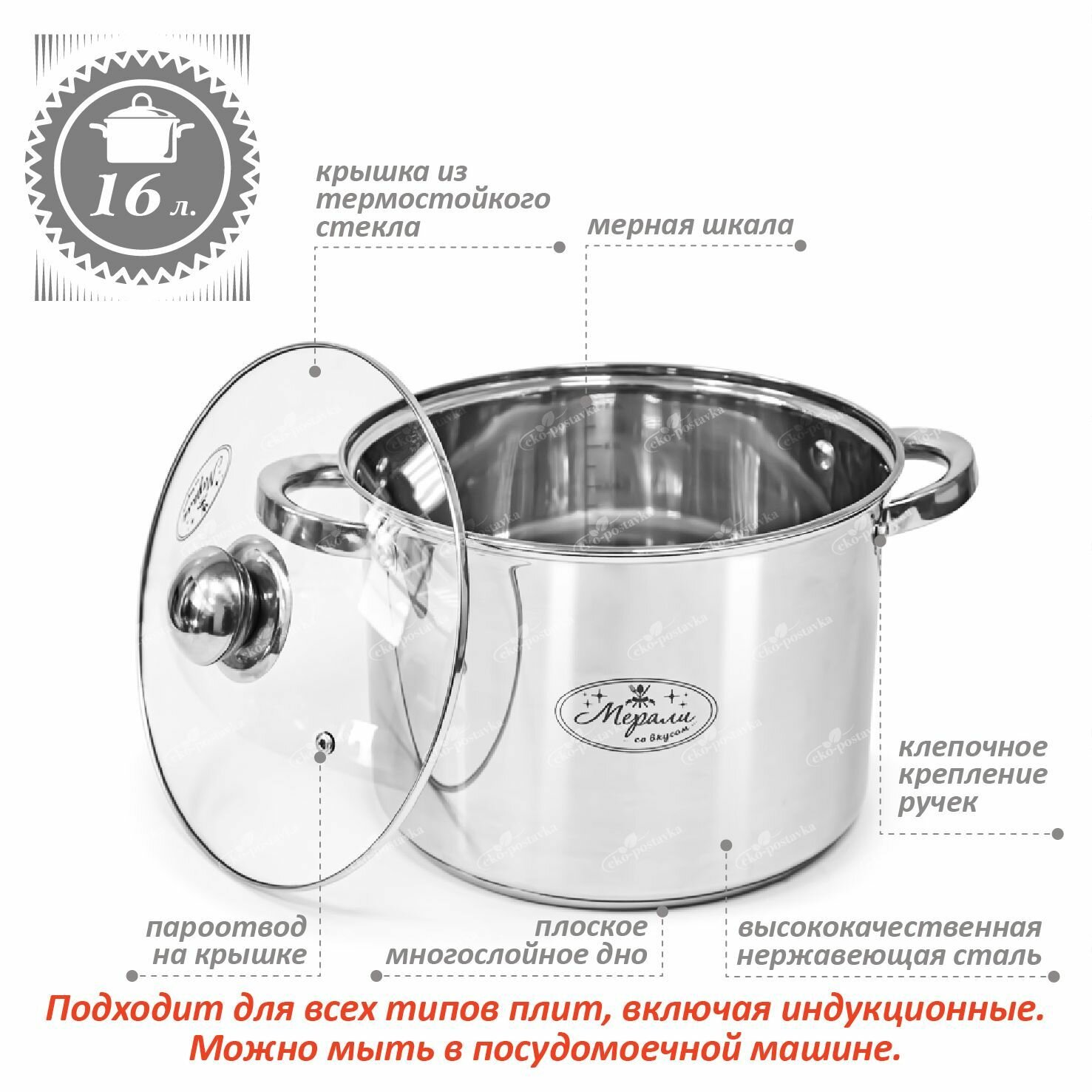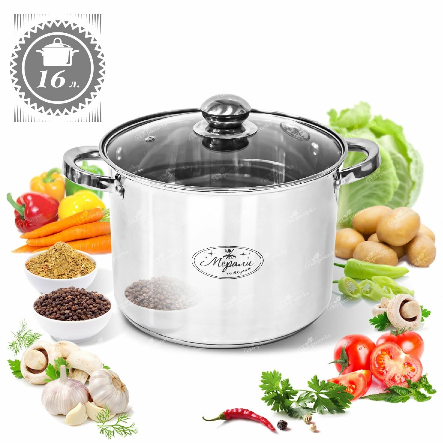 Кастрюля из нержавеющей стали с крышкой Мерали 16 л для газовых электрических и индукционных плит: сравнение цен, характеристики, фото, актуальное наличие и цены.