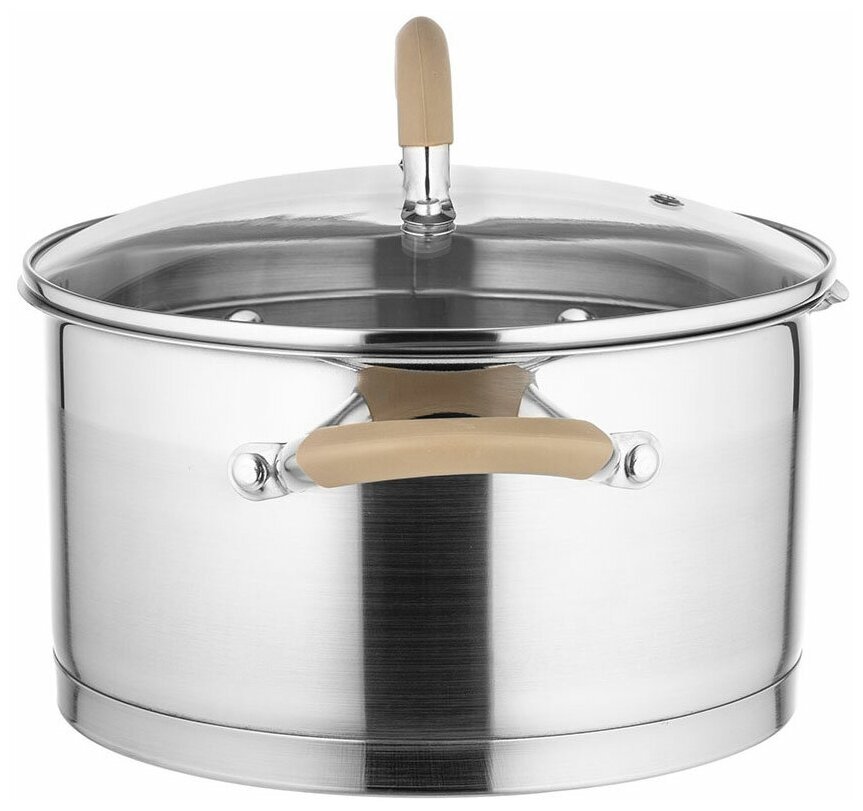 Кастрюля с крышкой Lara серии «Берлин» изготовлена из нержавеющей стали с высокими антикоррозийными свойствами. Капсулированное дно обеспечивает равномерное распределение тепла и быстрый нагрев содержимого, избегая пригорания пищи. В каждой кастрюле предусмотрен удобный слив для воды с отверстиями диаметром 3 и 6 мм. Силиконовые ручки стильного бежевого цвета не скользят и не нагреваются в процессе приготовления пищи. Вы легко сможете перемещать кастрюлю с горячим блюдом без использования прихваток. Крышка из жаропрочного стекла с отверстием для отведения пара выдерживает резкий перепад температур и обладает высокой термоустойчивостью. Крышка плотно прилегает к краям посуды, предотвращая проливание жидкости и сохраняя аромат блюд. Кастрюля имеет внутреннюю шкалу определения объема жидкости, что облегчает процесс приготовления пищи. Комбинирование матовой и зеркальной полировок придают кастрюле оригинальный вид и делают ее стильным элементом на вашей кухне. Внутренняя поверхность идеально ровная, что значительно облегчает мытье. Посуда серии «Берлин» подходит для использования на любых типах плит, включая индукционные. Кастрюля изготовлена из экологически чистой стали, соответствует нормам, позволяющим контактировать с пищей. Можно мыть в посудомоечной машине. Кастрюля упакована в цветную подарочную коробку и станет желанным подарком для любой хозяйки!