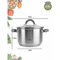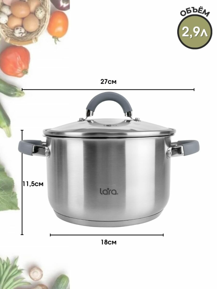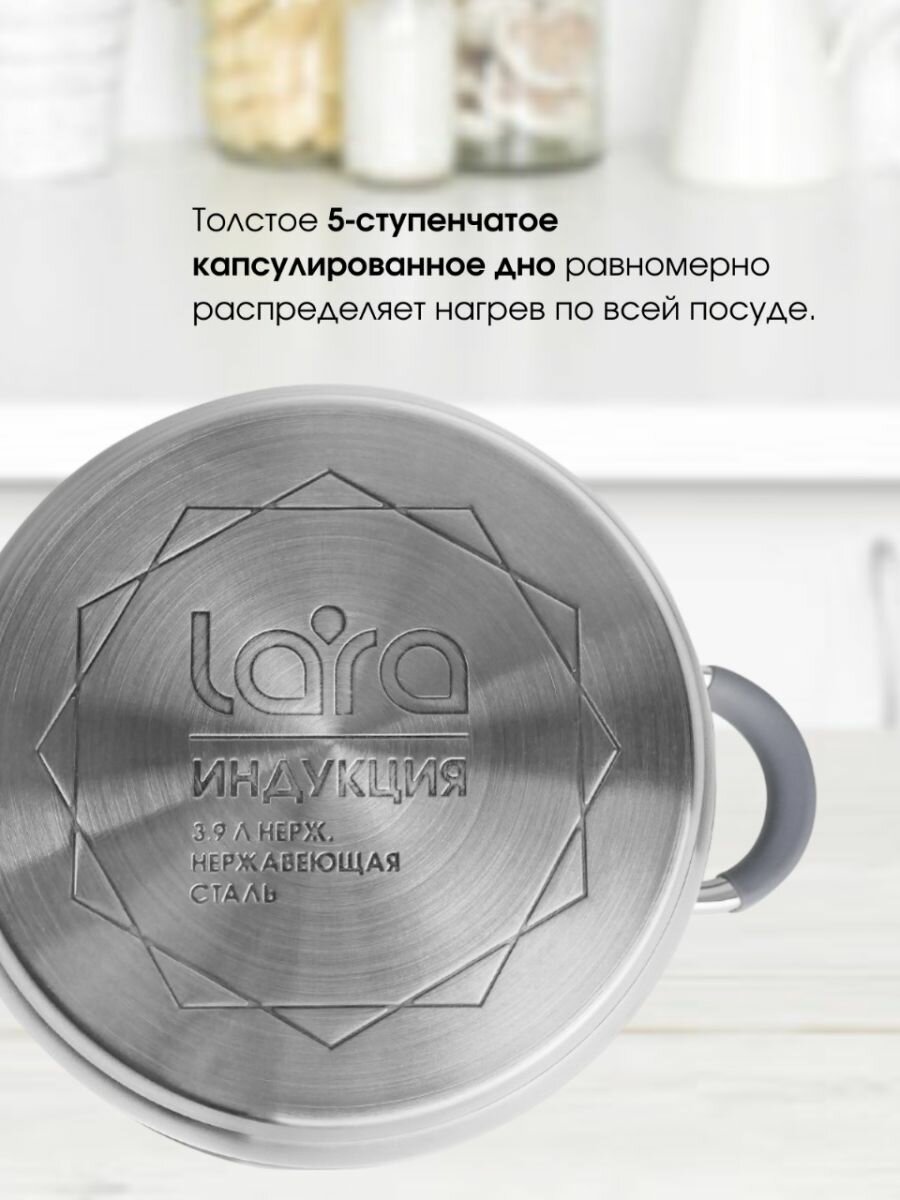 Кастрюля LARA LR02-273 Калипсо объемом 2.9 литра изготовлена из нержавеющей стали, что обеспечивает долговечность и надежность в использовании. Толщина стенок составляет 0.5 мм, а толщина дна - 4.5 мм, что гарантирует равномерное нагревание и сохранение тепла.