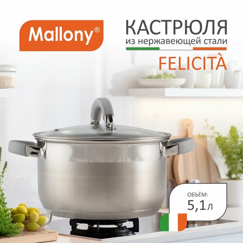 Кастрюля Felicità, объем 5,1 л, из нерж стали с крышкой из жаропрочного стекла, размер 22*13,5 см