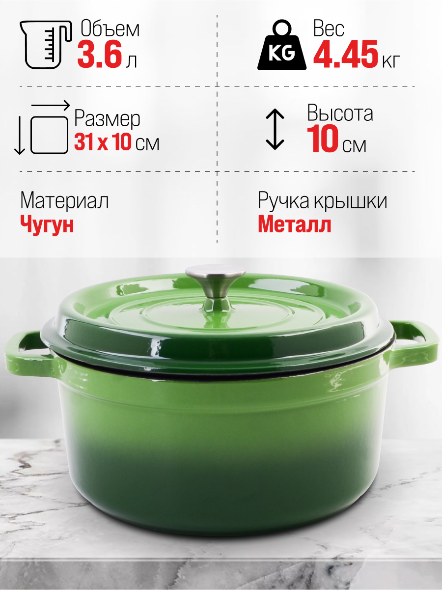 Чугунная кастрюля объемом 3,6 литра, покрытая эмалью, станет незаменимым помощником на вашей кухне.