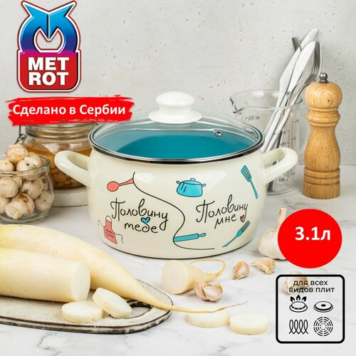 Кастрюля «Половинки» от METROT — это высококачественная эмалированная кастрюля объёмом 3,1 литра. Она выполнена из стали и покрыта эмалью, что обеспечивает прочность и долговечность изделия.