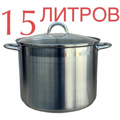 Большая высокая кастрюля бак на 16 литров из высококачественной нержавеющей стали с двойным пятислойным индукционным дном. В нутри мерная шкала, ручки не нагреваются, стеклянная крышка с паровыпуском диаметром 30 см.