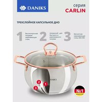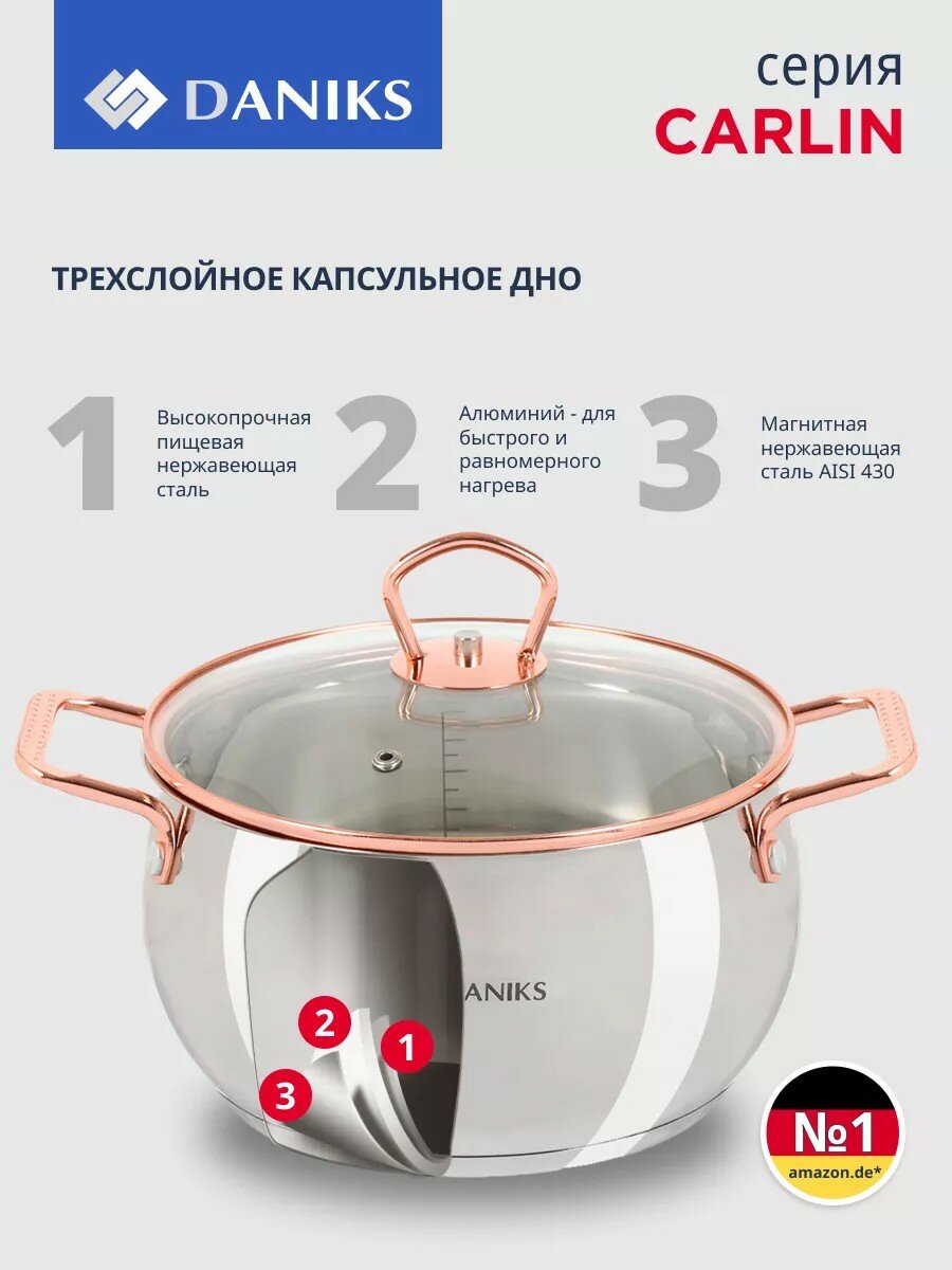 кастрюля изготовлена из высококачественной нержавеющей стали марки 18/0, которая отличается надежностью и долговечностью, рассчитана на интенсивное использование в течение длительного срока, на внутренней стенке расположена удобная и хорошо различимая мерная шкала для точного определения объема и количества ингредиентов, прочные ручки с надежным заклепочным креплением обеспечивают безопасное использование, элегантный дизайн посуды станет украшением любой кухни, трехслойное капсульное дно распределяет тепло по всей площади, равномерный прогрев дна позволяет избежать пригорания пищи, крышка изготовлена из термостойкого жаропрочного стекла с отверстием для выпуска пара, кастрюля подходит для использования на газовых, электрических, стеклокерамических и индукционных плитах, можно мыть в посудомоечной машине, благодаря наличию гладких стенок кастрюля легко очищается от остатков пищи обычным моющим средством и мягкой губкой