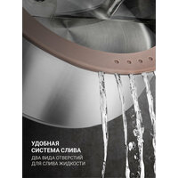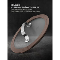 Комбинированная крышка из закаленного стекла с силиконовым ободом оригинальной конструкции, которая позволяет удобно сливать жидкость, а также обеспечивает выход пара. Силиконовый обод на крышке позволяет бесшумно закрывать кастрюлю, способствует более плотному прилеганию крышки, предотвращает появления сколов и царапин на посуде и кухонной поверхности. Цвет крышки - светло-коричневый.