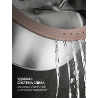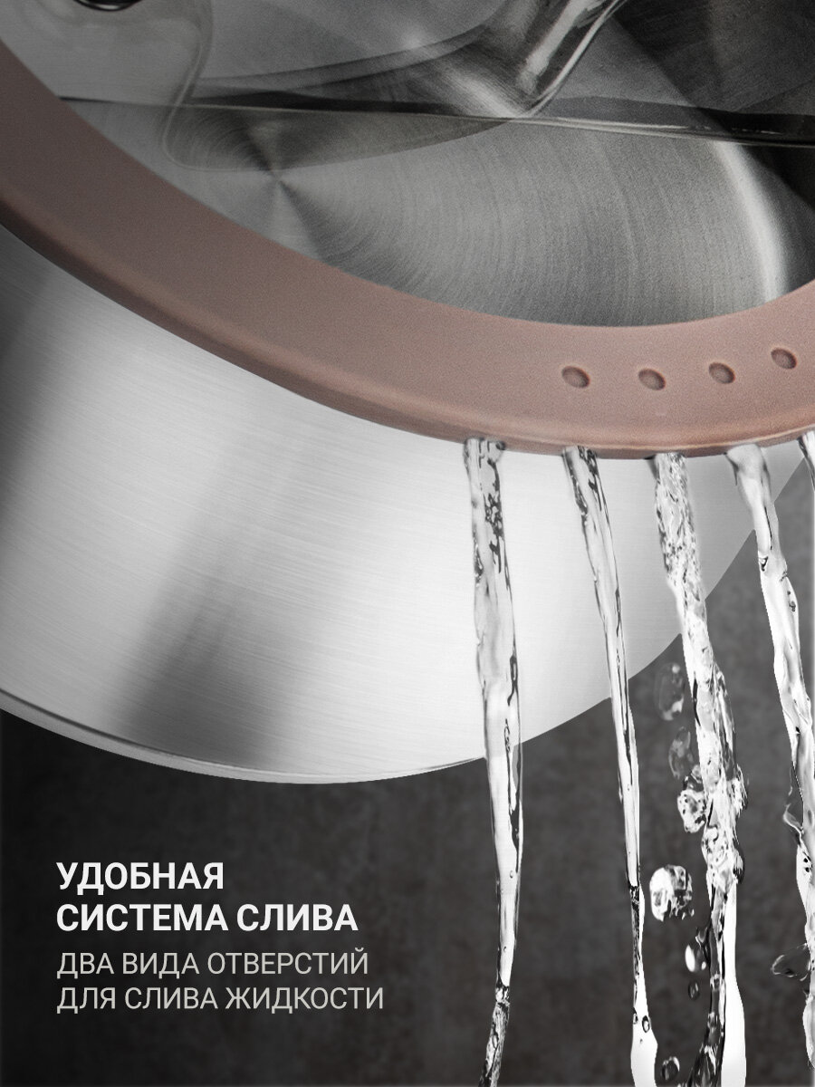 Комбинированная крышка из закаленного стекла с силиконовым ободом оригинальной конструкции, которая позволяет удобно сливать жидкость, а также обеспечивает выход пара. Силиконовый обод на крышке позволяет бесшумно закрывать кастрюлю, способствует более плотному прилеганию крышки, предотвращает появления сколов и царапин на посуде и кухонной поверхности. Цвет крышки - светло-коричневый.
