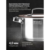 Кастрюля из нержавеющей стали 18/10. Толщина стенки - 0,6 мм, толщина дна - 4 мм. Полировка внешняя - матовая, внутренняя - матовая.