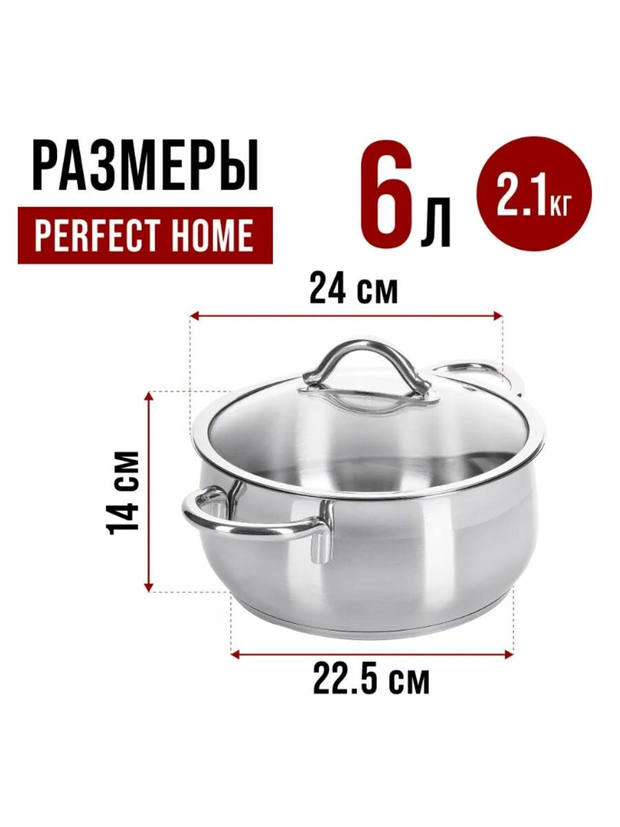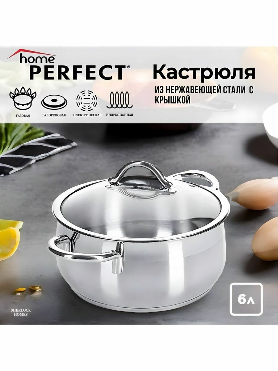 Кастрюля с крышкой HOME PERFECT выполнена из высококачественной нержавеющей стали с многослойным термоаккумулирующим дном, способствующим высокой теплопроводности и равномерному распределению тепла. Нержавеющая сталь обладает высокой устойчивостью к коррозии, не вступает в реакцию с холодными и горячими продуктами и полностью сохраняет их вкусовые качества. Посуда идеальна для приготовления здоровой пищи с минимальным количеством жира, что обеспечивает снижение потери витаминов, минеральных веществ и сохраняет аромат приготовленных блюд. Посуда очень удобна в использовании и элегантна. Крышка выполнена из термостойкого стекла с металлическим ободком и отверстием для выхода пара. Подходит для использования на всех типах плит, включая индукционные. Подходит для мытья в посудомоечной машине. Эта посуда незаменимый инвентарь для кухни, который подходит для приготовления различных блюд. Элегантный дизайн делают эту кастрюлю отличным подарком для мамы, бабушки или жены. Она прекрасно впишется в любой интерьер и поможет создать порядок и удобство на вашей кухне, а так же приготовить вкусный суп, жаркое или компот.