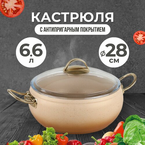 Кастрюля 6,6 л с антипригарным гранитным покрытием и стеклянной крышкой. Внутреннее многослойное антипригарное покрытие усилено гранитными частицами для повышения прочности и срока службы изделия. Покрытие не содержит PFOA, APFO, C8, экологически безопасно. Уплотненное дно 4 мм предотвращает деформацию, обеспечивает быстрый, равномерный нагрев. Высококачественное антипригарное покрытие позволяет готовить без масла или с минимальным его добавлением. Подходит для всех типов плит, кроме индукционных. Изготовлена из алюминия, нержавеющий материал. Неприхотлива в уходе. Устойчива к высоким температурам, инертна к химическому воздействию. Производство - Турция.