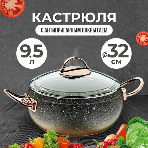 Кастрюля 9,5 л с антипригарным гранитным покрытием и стеклянной крышкой. Внутреннее многослойное антипригарное покрытие усилено гранитными частицами для повышения прочности и срока службы изделия. Не содержит PFOA, APFO, C8. Высококачественное антипригарное покрытие позволяет готовить без масла или с минимальным его добавлением. Уплотненное дно 4 мм предотвращает деформацию, обеспечивает быстрый, равномерный нагрев. Подходит для всех типов плит, кроме индукционных. Изготовлена из алюминия, нержавеющий материал. Неприхотлива в уходе. Устойчива к высоким температурам, инертна к химическому воздействию. Производство - Турция.