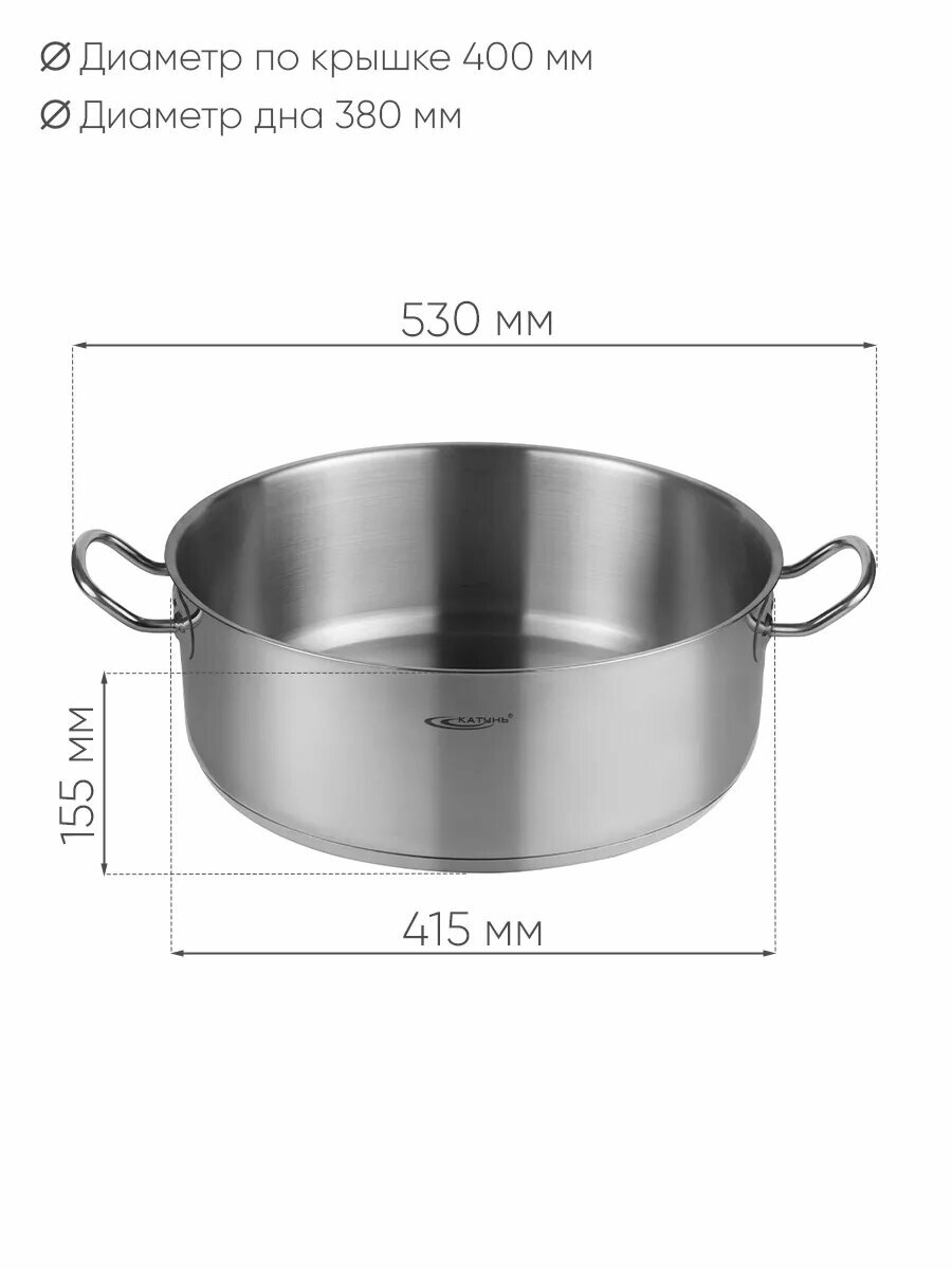 Кастрюля 18 л ТМ "Катунь" изготовлена из высококачественной нержавеющей стали. Благодаря многослойному термоаккумулирующему дну происходит равномерное распределение температуры по всей поверхности, что обеспечивает быстрое приготовление пищи. Ручки прикреплены методом клёпочной фиксации. Мерная шкала на внутренней стенке кастрюли поможет контролировать объем жидкости. Посуда данной серии подходит для всех современных типов плит, в том числе индукционных, а также для чистки в посудомоечной машине. Благодаря большому объёму кастрюля подойдет для приготовления блюд для большой семьи или сезонных заготовок. Объем кастрюли 18 л, диаметр по крышке 40 см, диаметр дна 38 см, высота стенки 15.5 см. Сделано в России. Обращаем Ваше внимание, кастрюля поставляется без крышки.