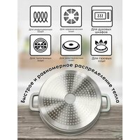 Также можно купить кастрюлю 1,5 л, 4,5 л. Кастрюля и сковорода отлично дополняют друг друга. Ручки позволяют использовать кастрюлю в духовом шкафу, также есть съемные силиконовые насадки на ручки. Функциональность посуды увеличивает стеклянная крышка из термостойкого стекла с паровыпуском.
