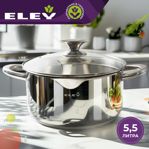 Предпочитаете современный минималистичный дизайн? Тогда посуда коллекции ELEY точно придется вам по вкусу! С первого взгляда она очаровывает простыми формами, которые гармонично впишутся в любой кухонный интерьер. Настоящие эстеты по достоинству оценят сочетание матированной полировки корпуса с глянцевыми аксессуарами: эффектное и очень изысканное. Кастрюля с крышкой ELEY 24 см 5,5 л изготовлена из высококачественной нержавеющей стали 18/10, которая гарантирует посуде длительный срок службы. Пятислойное капсульное дно обеспечивает быстрый равномерный прогрев всей поверхности и идеальное приготовление блюд. Кастрюля оснащена крышкой из термостойкого стекла с отверстием для выхода пара. Для особого удобства в использовании на внутренней поверхности стенки посуды имеются отметки литража.