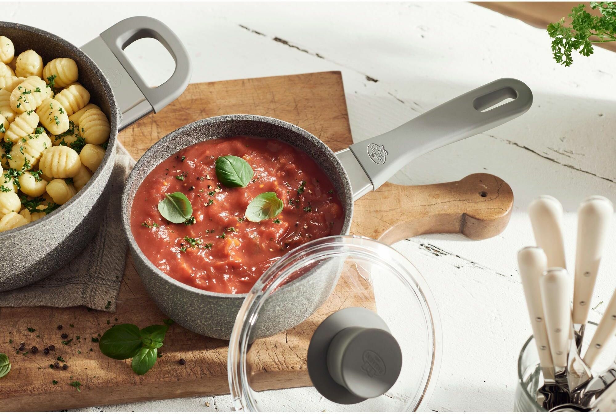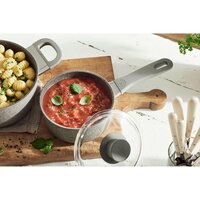 Кастрюля с крышкой Мурано 24 см изготовлена из высококачественного алюминия, кованого в холодном состоянии. Благодаря встроенному в основание стальному сердечнику он отлично подходит для индукционных кухонь, а его радиальная структура значительно ускоряет распределение тепла внутри. Пятислойное покрытие Granitium Extreme, состоящее из минеральных частиц, предотвращает прилипание пищи и устойчиво к механическим повреждениям, поэтому вы можете успешно использовать металлическую кухонную утварь без риска повреждения. Удобные ручки не нагреваются, что является гарантией безопасного использования. Он поставляется со стеклянной крышкой с пластиковой ручкой.