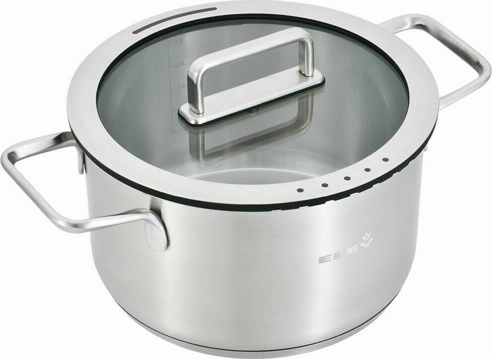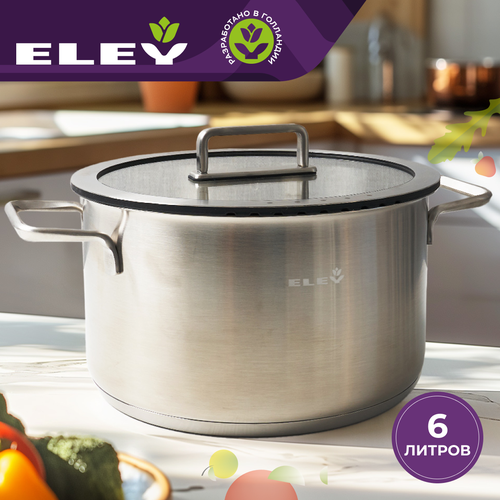 Предпочитаете современный минималистичный дизайн? Тогда посуда коллекции ELEY точно придется вам по вкусу! С первого взгляда она очаровывает простыми формами, которые гармонично впишутся в любой кухонный интерьер. Настоящие эстеты по достоинству оценят сочетание матированной полировки корпуса с глянцевыми аксессуарами: эффектное и очень изысканное. Кастрюля с крышкой ELEY 24 см 6 л изготовлена из высококачественной нержавеющей стали 18/10, которая гарантирует посуде длительный срок службы. Пятислойное капсульное дно обеспечивает быстрый равномерный прогрев всей поверхности и идеальное приготовление блюд. Кастрюля оснащена крышкой из термостойкого стекла с отверстием для выхода пара. Для особого удобства в использовании на внутренней поверхности стенки посуды имеются отметки литража.
