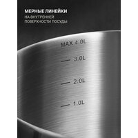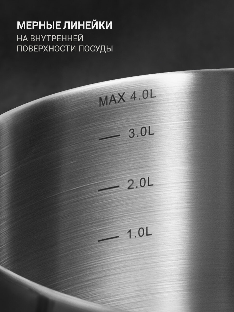 многослойное дно; мерная шкала; материал крышки: стекло; материал ручек: сталь, силиконовые вставки; крышка с двухсторонней перфорацией различного диаметра и специальная форма края кастрюли позволяет легко сливать жидкость