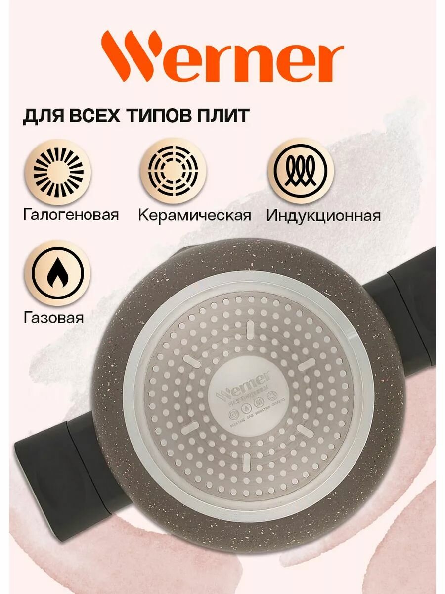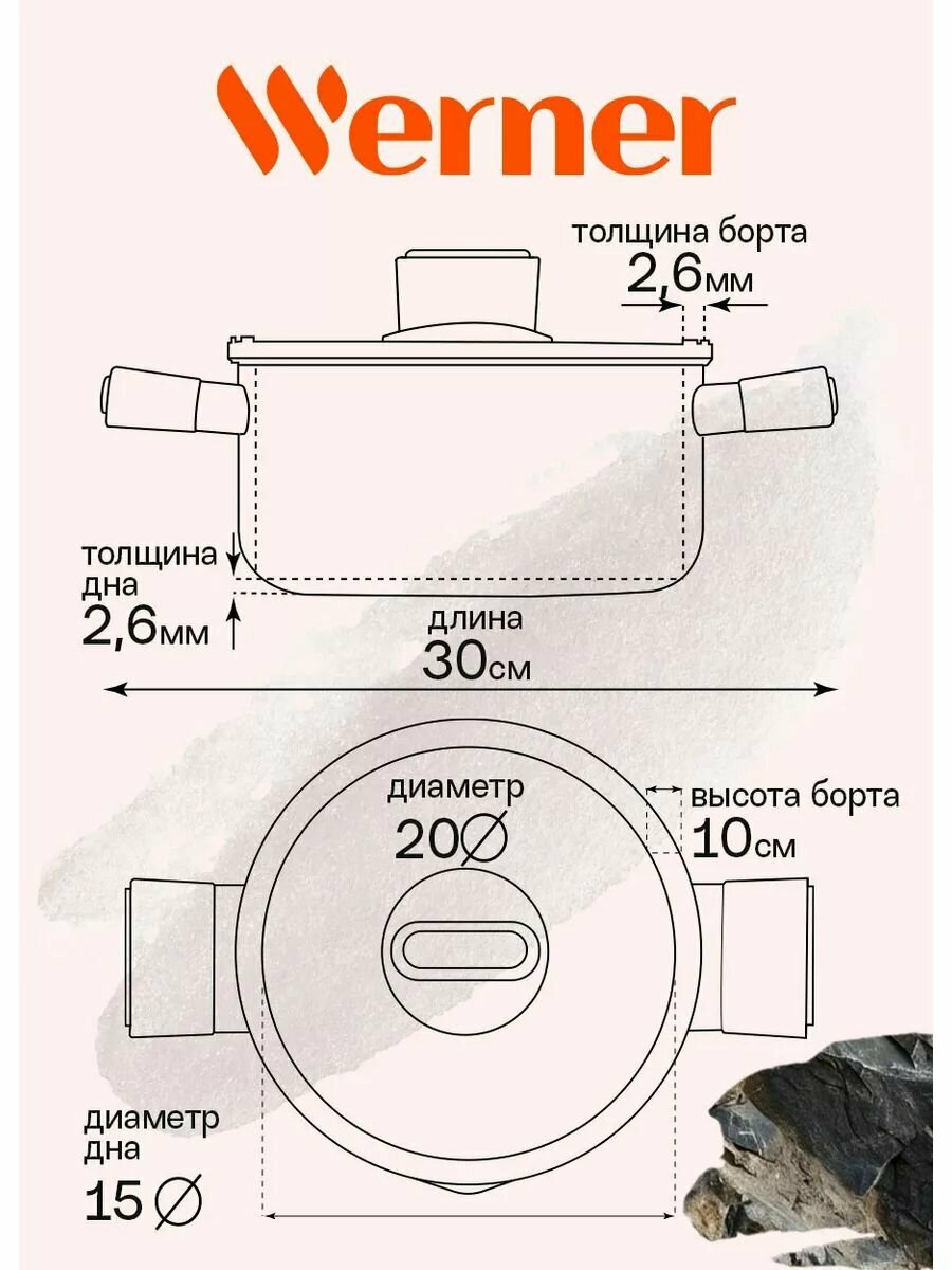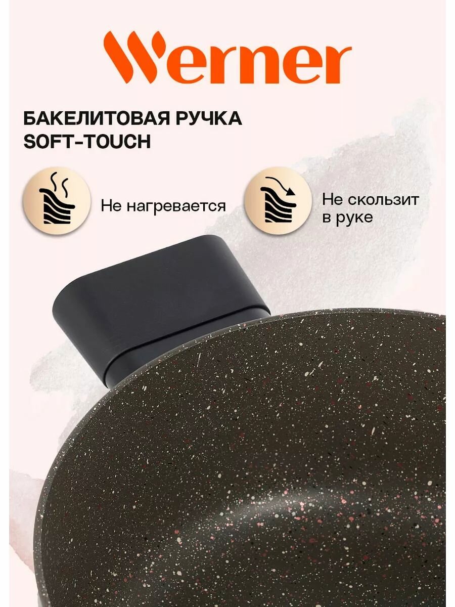 Серия Organic – это сочетание стиля и практичности. Уникальная особенность коллекции – это возможность собрать набор посуды для приготовления в трех цветах (бежевом - Organic Beige, зеленом - Organic Forest style и коричневом - Organic Stone style), которые будут гармонично дополнять друг друга. кастрюля Werner Organic Stone style 51450 диаметром 20 см, изготовлена из прессованного алюминия, что позволяет ей быстро и равномерно нагреваться. Кастрюля с 2-слойным антипригарным мраморным покрытием исключает пригорание, имеет длительный срок службы, обладает отличной износостойкостью и устойчивостью к царапинам. Ручки черного цвета, изготовлены из бакелита с покрытием Soft Touch – термостойкого пластика, который не нагревается и не скользит в руке. У кастрюли имеется носик для слива жидкости и стеклянная крышка с силиконовым ободом. Коллекция Werner Organic выполнена в натуральных природных тонах. Кастрюля в коричневом цвете с вкраплениями трех оттенков, напоминающим текстуру натурального камня. Органично впишется в любой интерьер. Это идеальный вариант для ежедневного применения. В кастрюле объемом 2,8 л отлично получаются каши, супы и другие блюда. Соберите свой набор из посуды для приготовления Organic. Кастрюля в фирменной упаковке.