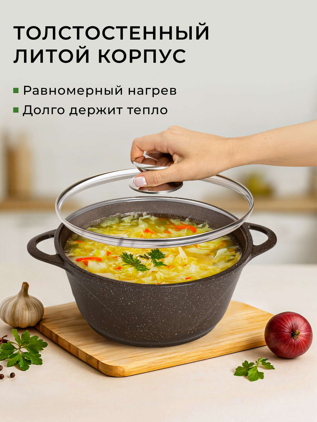 использование в духовке, мытье в посудомоечной машине, с крышкой, толстое дно