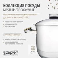Большая кастрюля 5 л идеально подходит для приготовления птицы, мяса, риса, макаронных изделий, супов, овощей, карри, морепродуктов, картофеля и многого другого. Часто используется для приготовления свежевыжатых соков, джемов, компотов и морсов. Данная кастрюля - идеальное сочетание превосходного Zepter металла 316L, термоаккумулирующего компактного дна Цептер (ЗАК) и крышки, которая герметично закрывает посуду для здорового приготовления пищи в собственном соку при низких температурах.