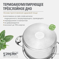Корпус нержавеющей посуды Zepter выполнен из металла 316L. Он всегда немного холоднее дна, благодаря чему обеспечивается конденсация питательной жидкости и ее циркуляция внутри посуды.