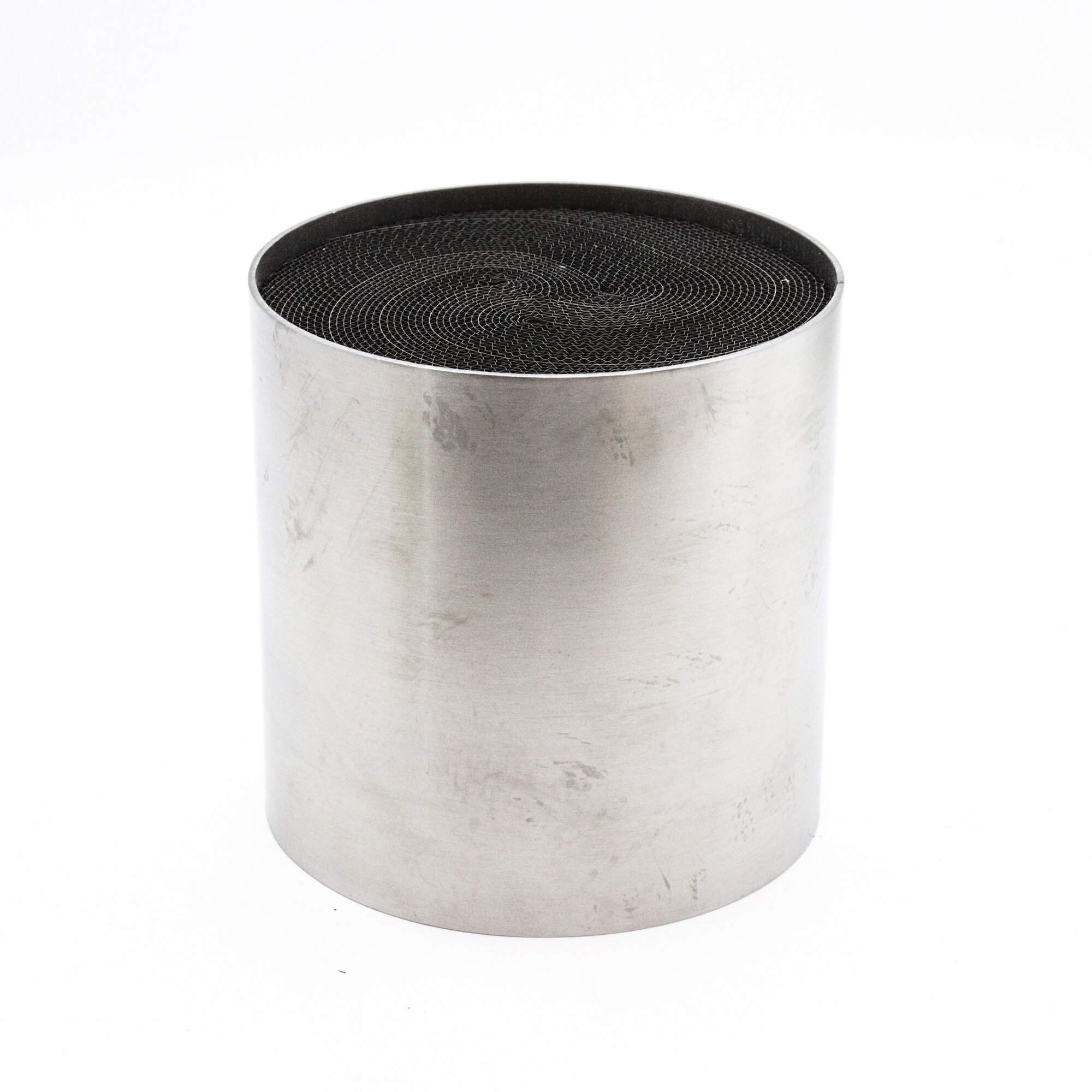 Корпус катализатора изготовлен из нержавеющей стали AISI 441 марки, которая обладает высокими антикоррозийными свойствами, устойчива к химическим и термическим воздействиям, а также хорошо варится. Ячейки катализатора выполнены из сплава железа, хром и алюминия, что обеспечивает их долговечность и надежность. НЕ содержит напыление из драгоценных металлов.