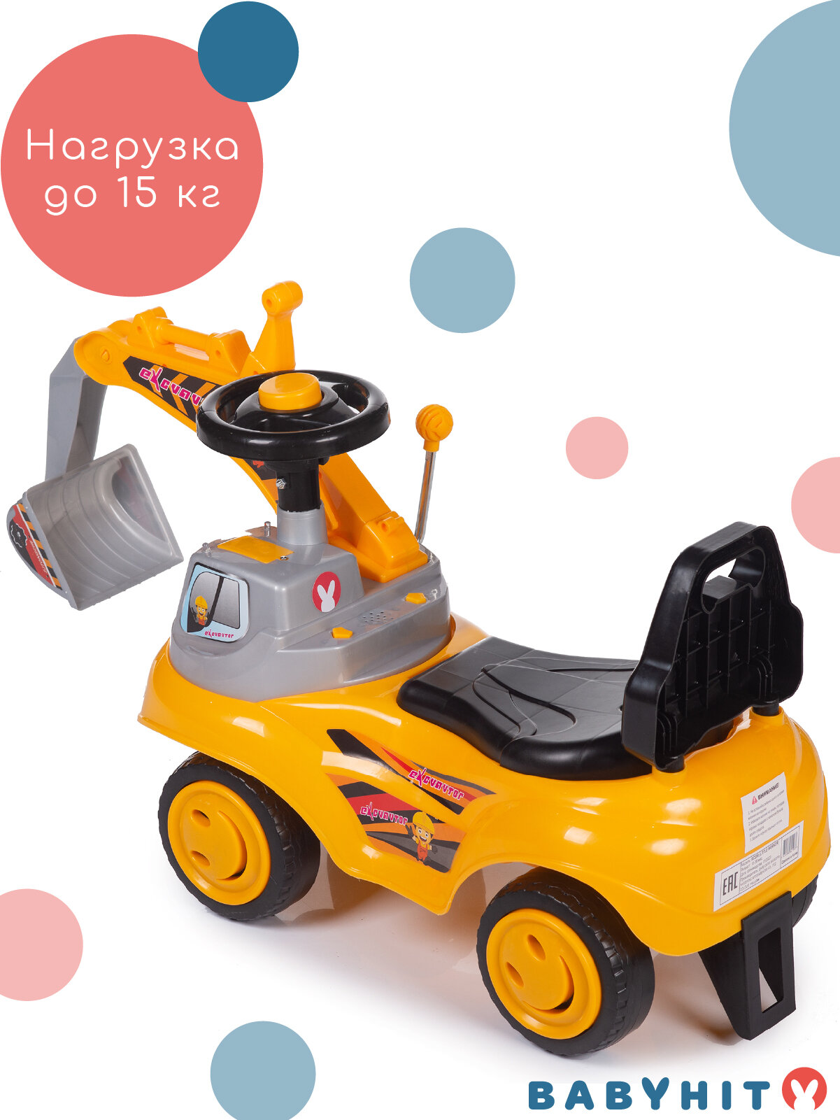 Игрушка для катания детей - толокар Для детей от 1,5 до 3 лет Подвижный ковш Световые и звуковые эффекты Пластиковые колеса Багажник под сиденьем Для работы потребуется 2 батарейки ААА (в комплект не входят) Максимальная нагрузка 15 кг Габариты игрушки - 77 х 26 х 44 (ДхШхВ) см Размер сиденья - 22 х 18,5 (ДхШ) см Высота до сиденья - 21,5 см Диаметр колес - 13 см Масса: 1,75 кг