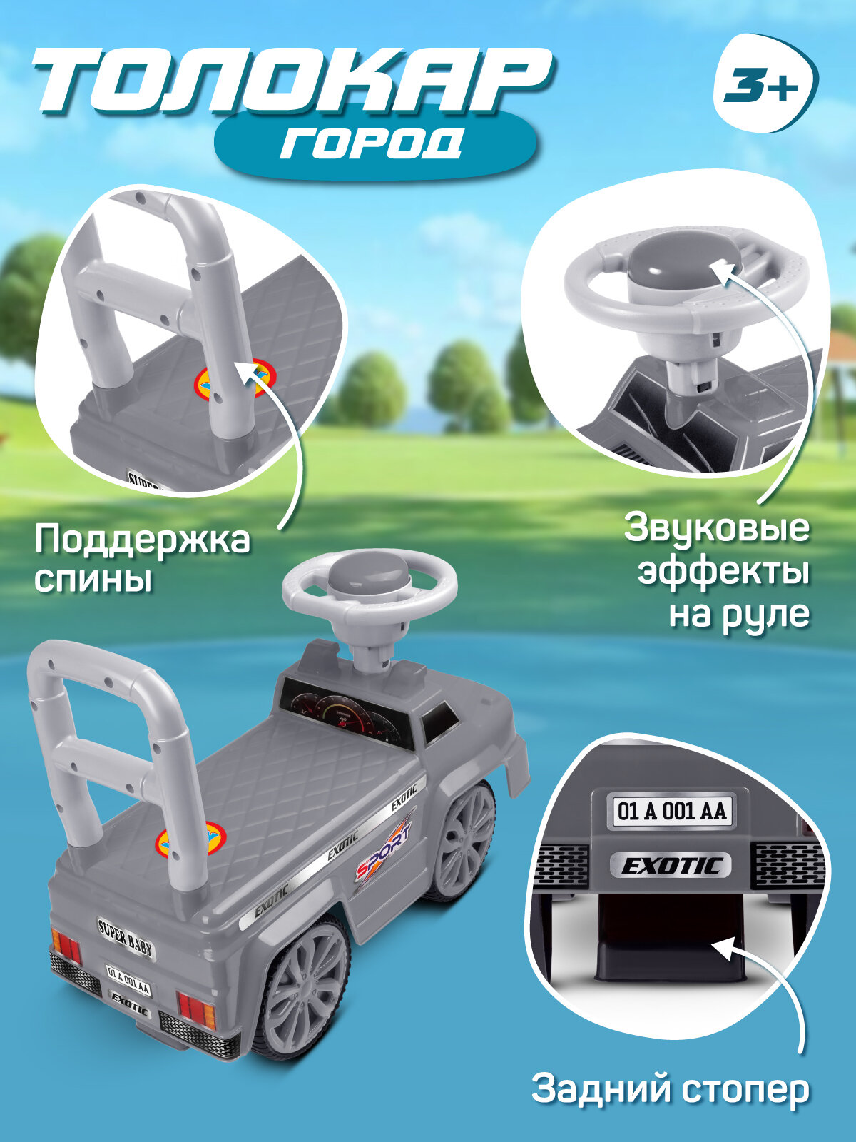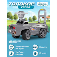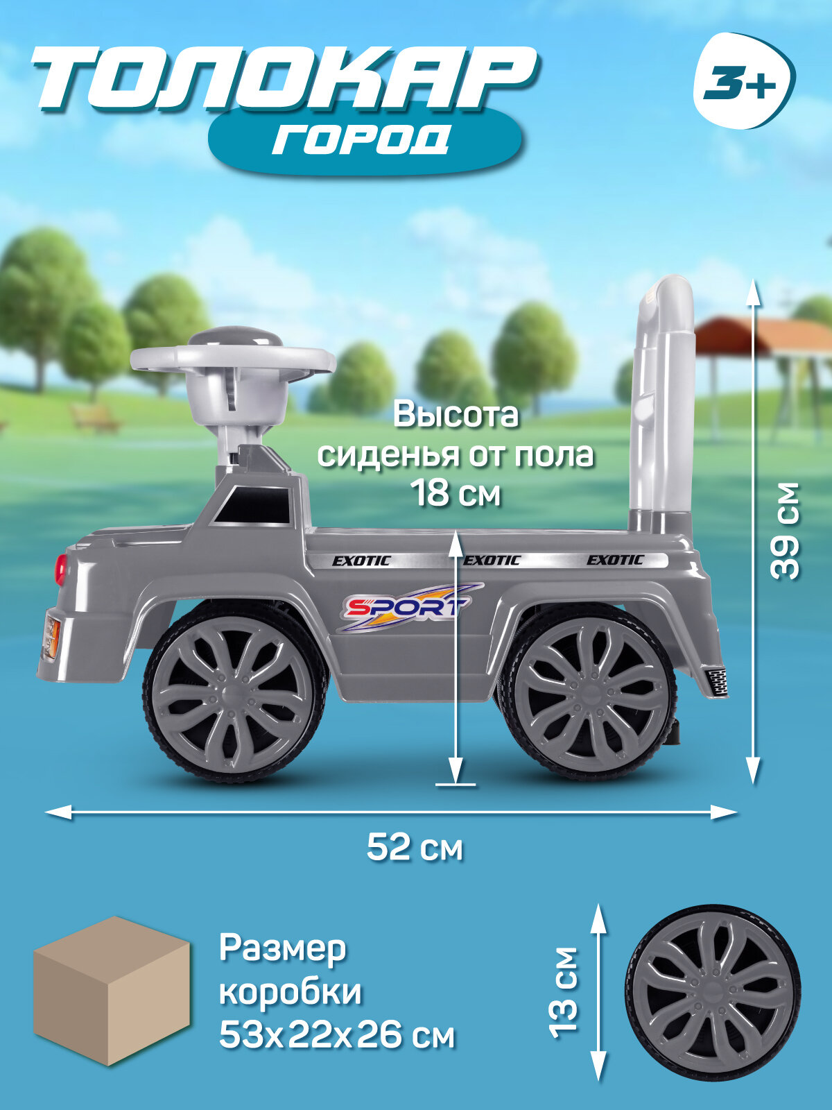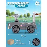 Каталка изготовлена из качественной пластмассы, не содержащей вредных веществ. На руле расположена кнопка с пищалкой. Под сиденьем находится вместительный отсек, в котором можно перевозить небольшие предметы.