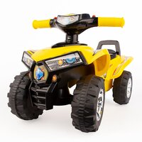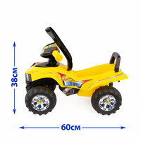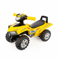 Каталка с большими пластиковыми колесами (диаметр 18см) выполнена в виде квадроцикла. Для детей возрастом от 1 года, весом до 27кг. Руль со звуковыми (12 мелодий и звук сирены) и световыми эффектами (2 батарейки АА, в комплект не входят). Удобное широкое сиденье (25х15.5см) обеспечивает комфортную посадку ребенка. Высота от пола до сидения 24см. Под крышкой сидения расположен багажный отсек. Спинку сидения заменяет ручка, пользуясь которой, каталку можно толкать. Клиренс 8см. Руль выполнен в эргономичном дизайне, удобном для руки ребенка. Высота до руля 38см. Защита от опрокидывания сзади.