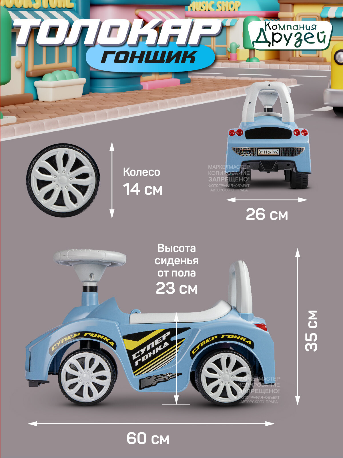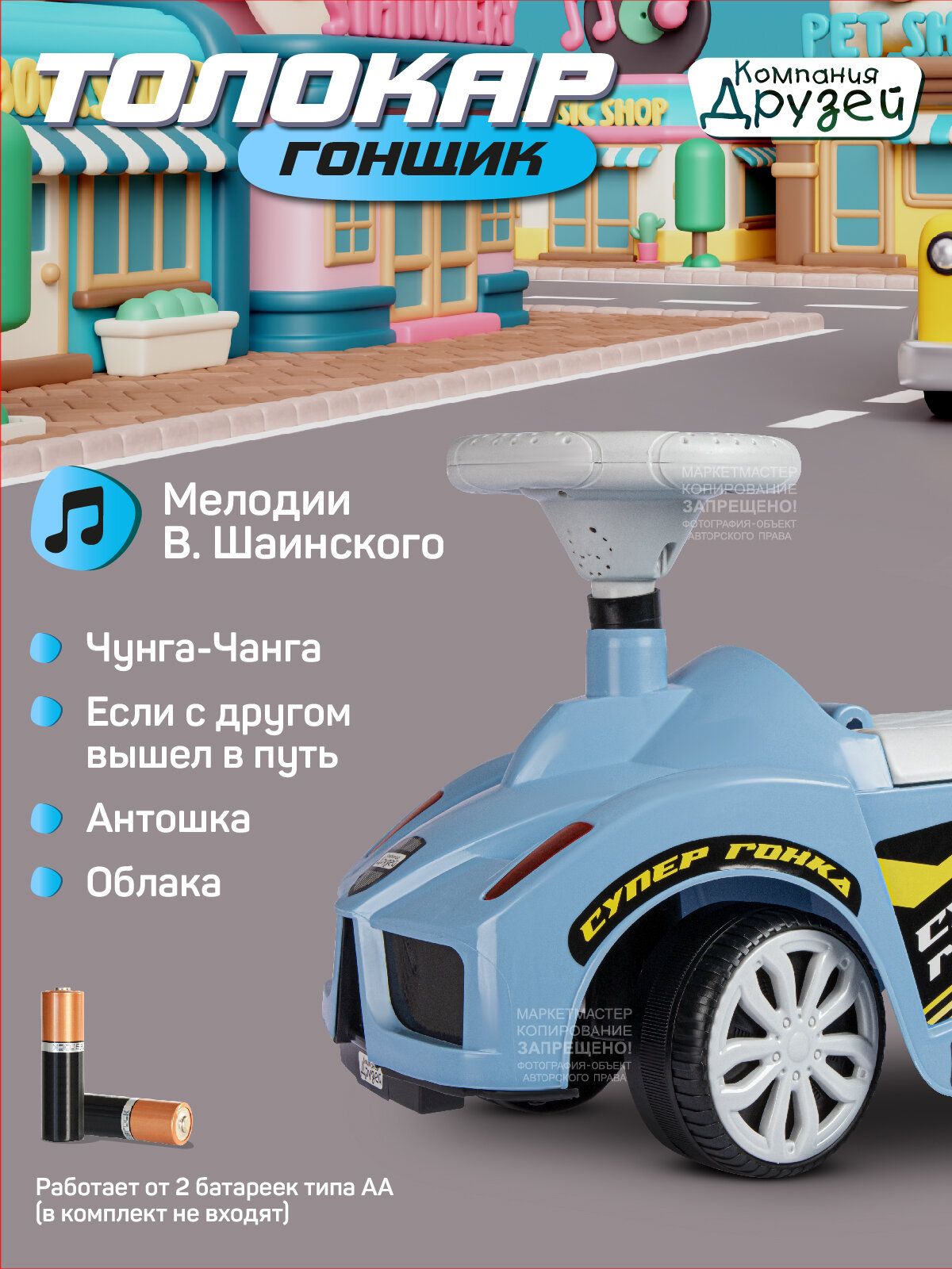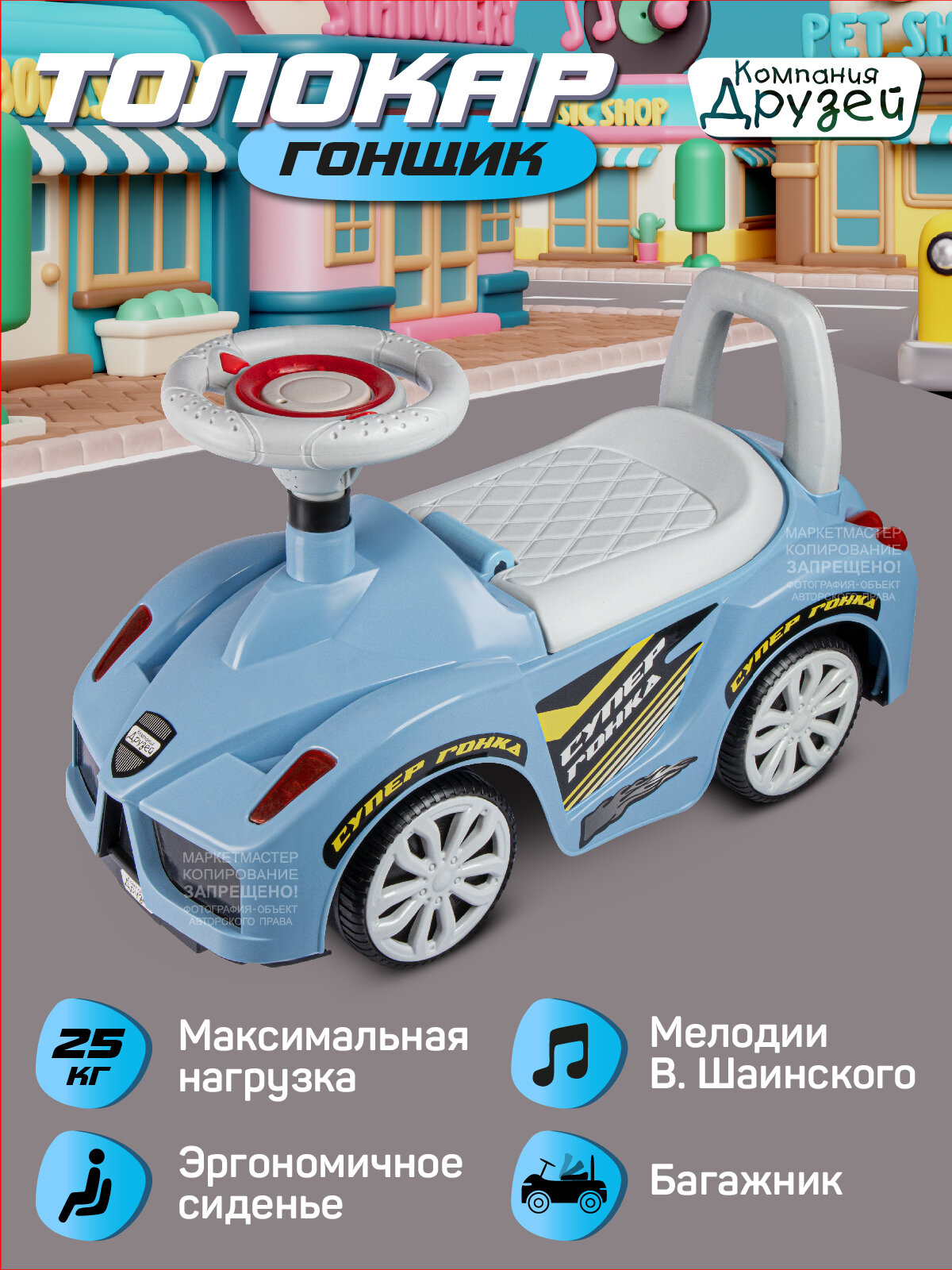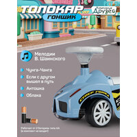 Каталка толокар Машина ТМ "Джамбо Тойз" с мелодиями В.Шаинского – первое транспортное средство в жизни ребёнка. Это универсальная игрушка, которая подарит новые эмоции и станет прекрасным подарком для малышей, начинающих ходить и для детей постарше. Каталка-пушкар идеально подойдет ребёнку благодаря ряду особенностей: • При нажатии кнопки на руле воспроизводятся мелодии В.Шаинского из мультфильмов "Чунга-Чанга", "Если с другом вышел в путь", "Антошка", "Облака". • Толокар выполнен в виде гоночного автомобиля, на нем можно кататься не только дома, но и на улице. • Цветные наклейки, реалистичный дизайн, пластиковые фары, имитация спидометра и литых дисков сделают каталку по-настоящему любимой игрушкой. • Машинка-каталка легкая и простая в управлении. • Широкие пластиковые колеса придают устойчивость. • Удобное эргономичное сиденье выполнено с учетом особенностей строения детского тела. • Высокая спинка обеспечивает поддержку для спины и дополнительную безопасность при катании, а также служит малышу опорой при ходьбе. • Под сиденьем находится вместительный отсек, в котором можно перевозить любимые игрушки или небольшие предметы. Каталка не имеет острых краев и мелких деталей, изготовлена из качественной пластмассы, не содержащей вредных веществ. Игрушка полностью безопасна для детей, имеет необходимый сертификат и соответствует установленным требованиям. В процессе катания ребёнок будет развивать мышцы ног, вестибулярный аппарат, а также совершенствовать навыки ходьбы.
