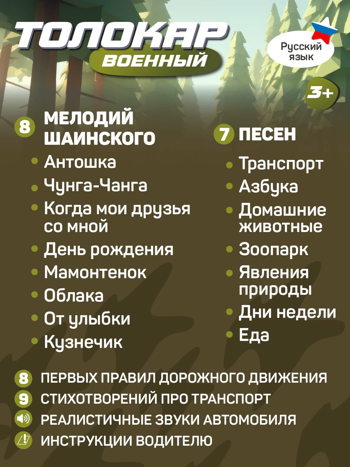 • Цветные наклейки в военной тематике, реалистичный дизайн, веселая музыка, сделают каталку по-настоящему любимой игрушкой.