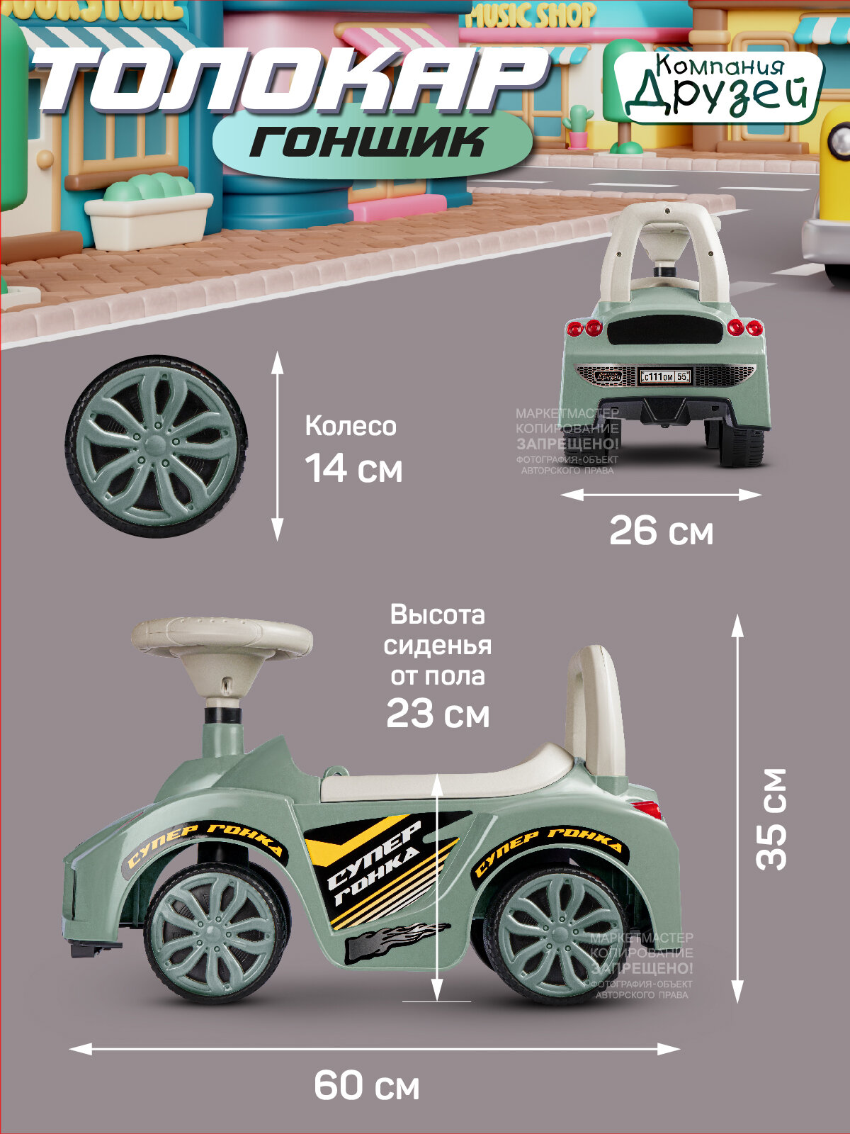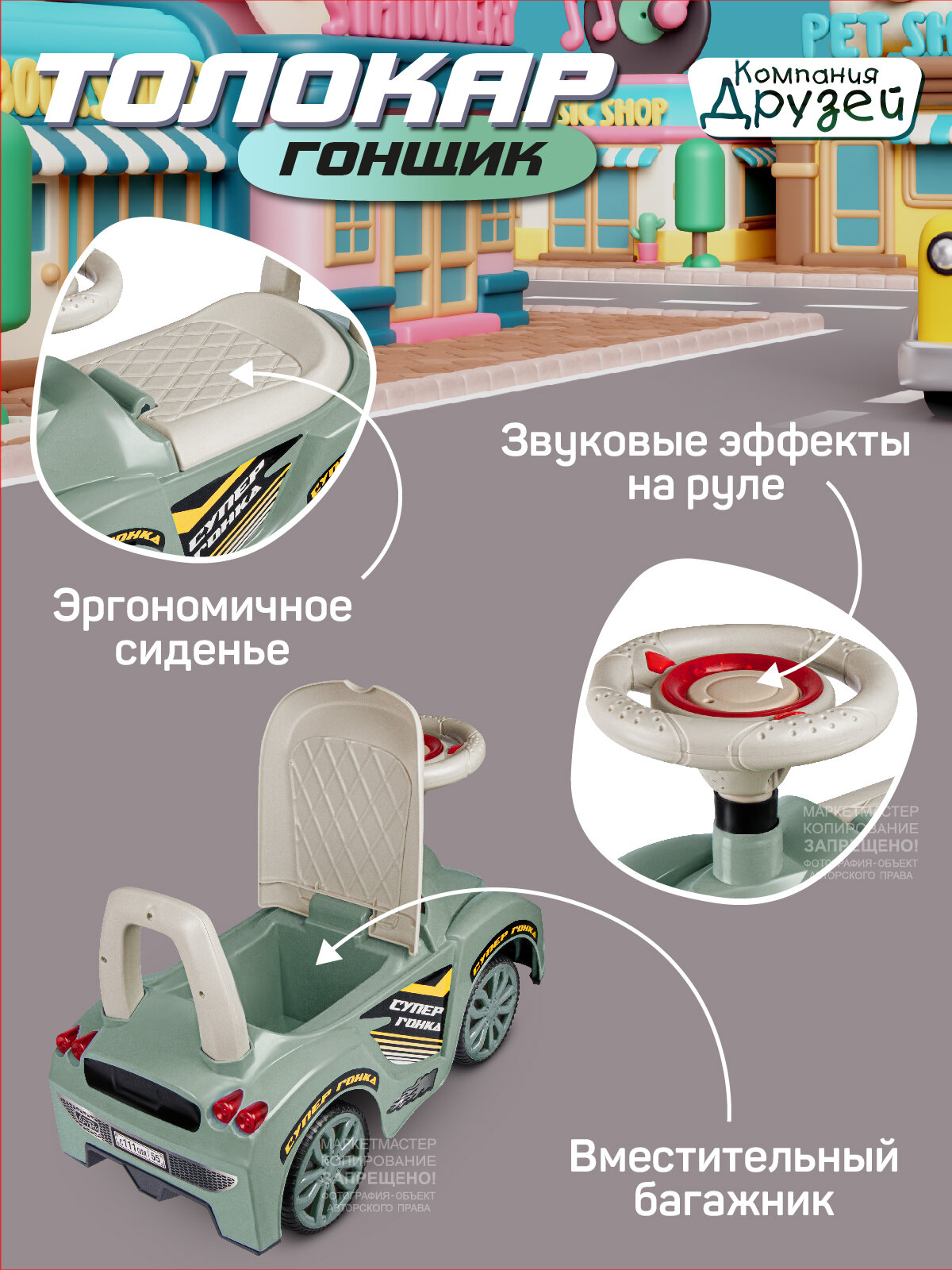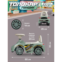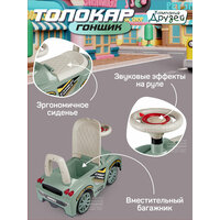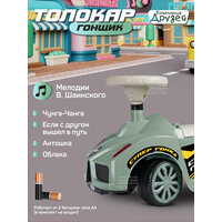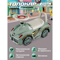 Каталка толокар Машина ТМ "Джамбо Тойз" с мелодиями В.Шаинского – первое транспортное средство в жизни ребёнка. Это универсальная игрушка, которая подарит новые эмоции и станет прекрасным подарком для малышей, начинающих ходить и для детей постарше. Каталка-пушкар идеально подойдет ребёнку благодаря ряду особенностей: • При нажатии кнопки на руле воспроизводятся мелодии В.Шаинского из мультфильмов "Чунга-Чанга", "Если с другом вышел в путь", "Антошка", "Облака". • Толокар выполнен в виде гоночного автомобиля, на нем можно кататься не только дома, но и на улице. • Цветные наклейки, реалистичный дизайн, пластиковые фары, имитация спидометра и литых дисков сделают каталку по-настоящему любимой игрушкой. • Машинка-каталка легкая и простая в управлении. • Широкие пластиковые колеса придают устойчивость. • Удобное эргономичное сиденье выполнено с учетом особенностей строения детского тела. • Высокая спинка обеспечивает поддержку для спины и дополнительную безопасность при катании, а также служит малышу опорой при ходьбе. • Под сиденьем находится вместительный отсек, в котором можно перевозить любимые игрушки или небольшие предметы. Каталка не имеет острых краев и мелких деталей, изготовлена из качественной пластмассы, не содержащей вредных веществ. Игрушка полностью безопасна для детей, имеет необходимый сертификат и соответствует установленным требованиям. В процессе катания ребёнок будет развивать мышцы ног, вестибулярный аппарат, а также совершенствовать навыки ходьбы.