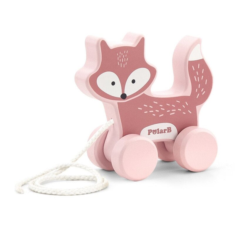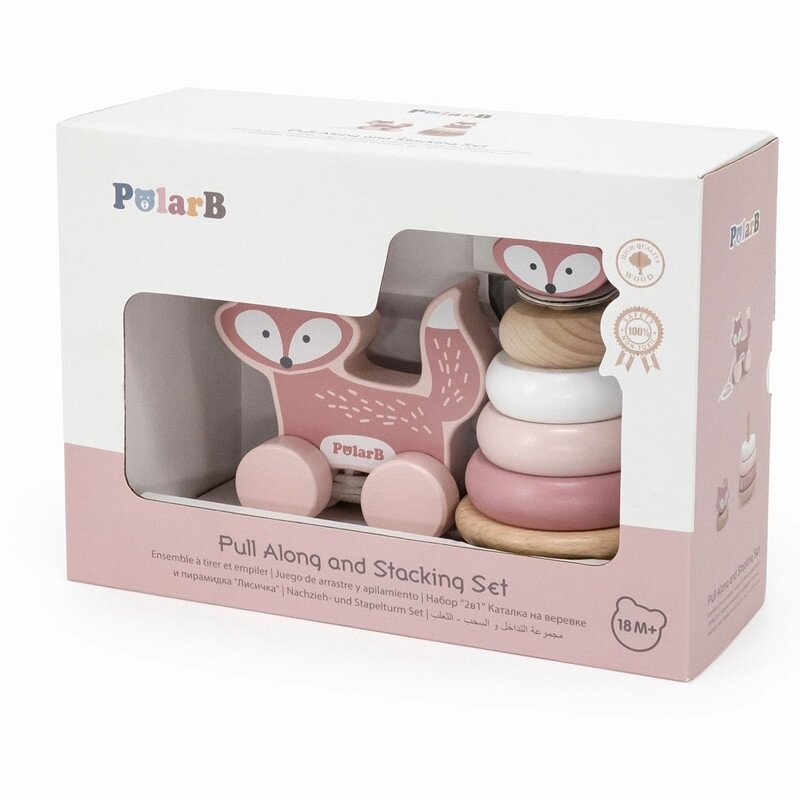Купить Каталка Polar B розовая на веревке, набор 2 в 1 с пирамидкой лисичкой, 4 съемных разноцветных бублика с доставкой по всей России.